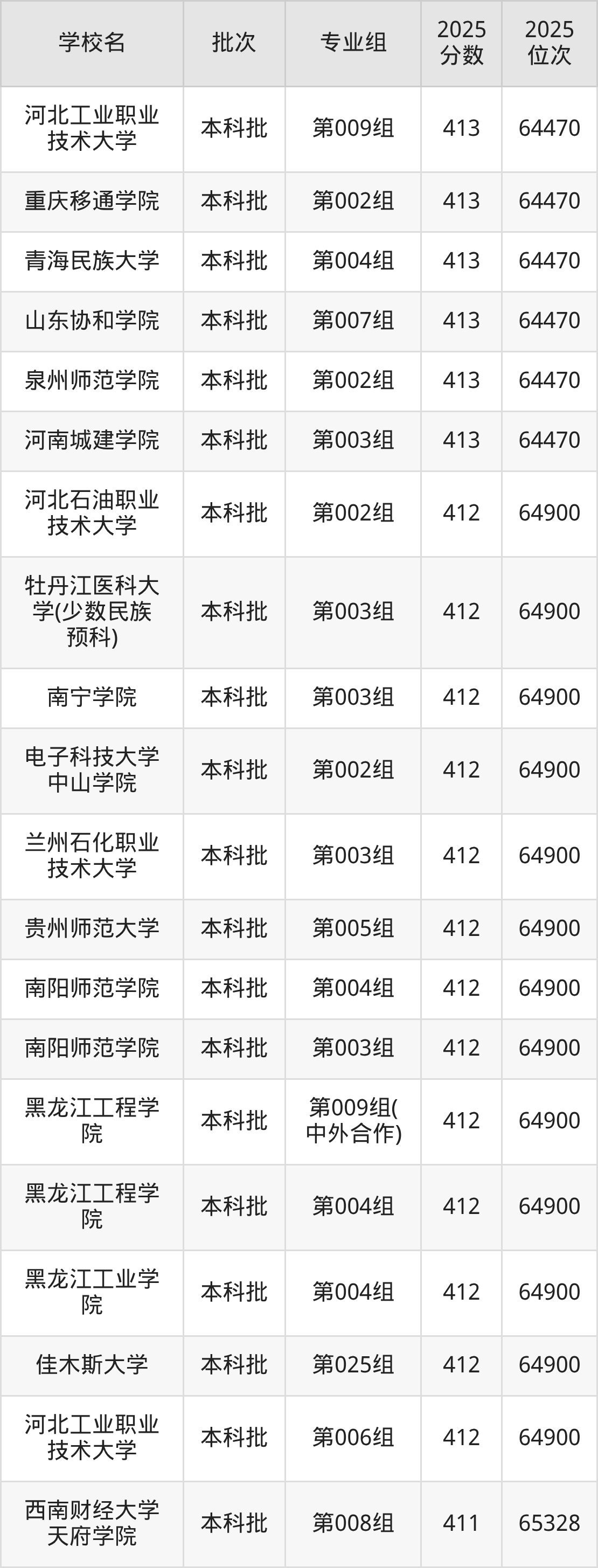 2025年黑龙江高考物理类412分(64471名~64900名)能上的大学有河北石油职业技术大学第002组、河北工业职业技术大学第006组、佳木斯大学第025组、黑龙江工业学院第004组等。