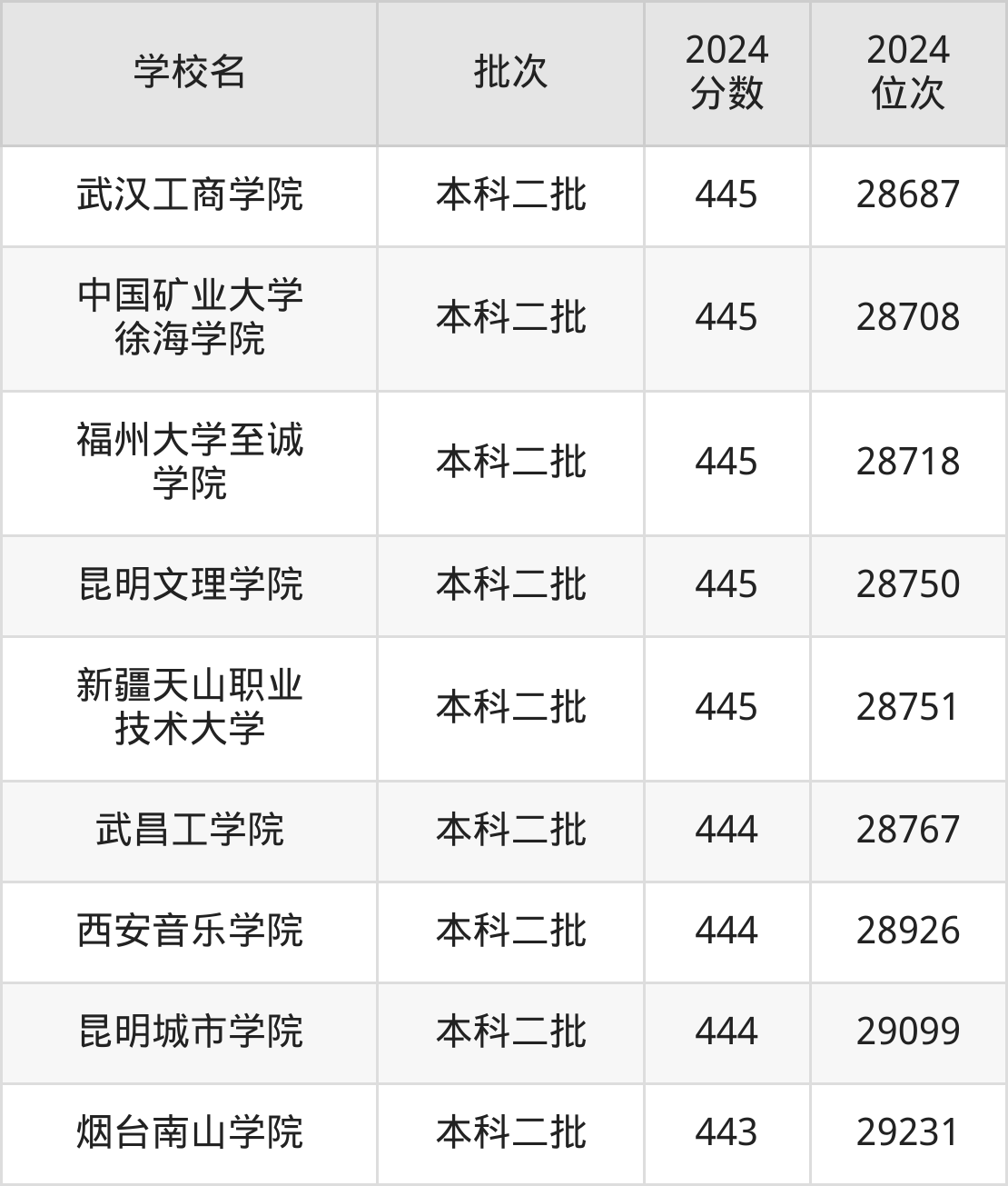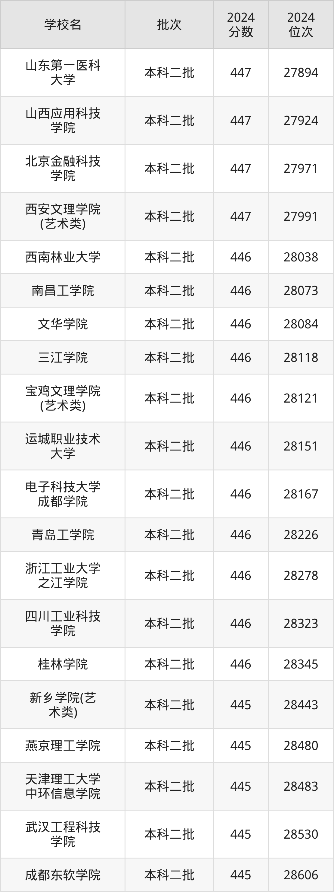 这些都是2025年高考文科28395名~28759名考生可以报考的大学,更多学校名单如下表所示:
