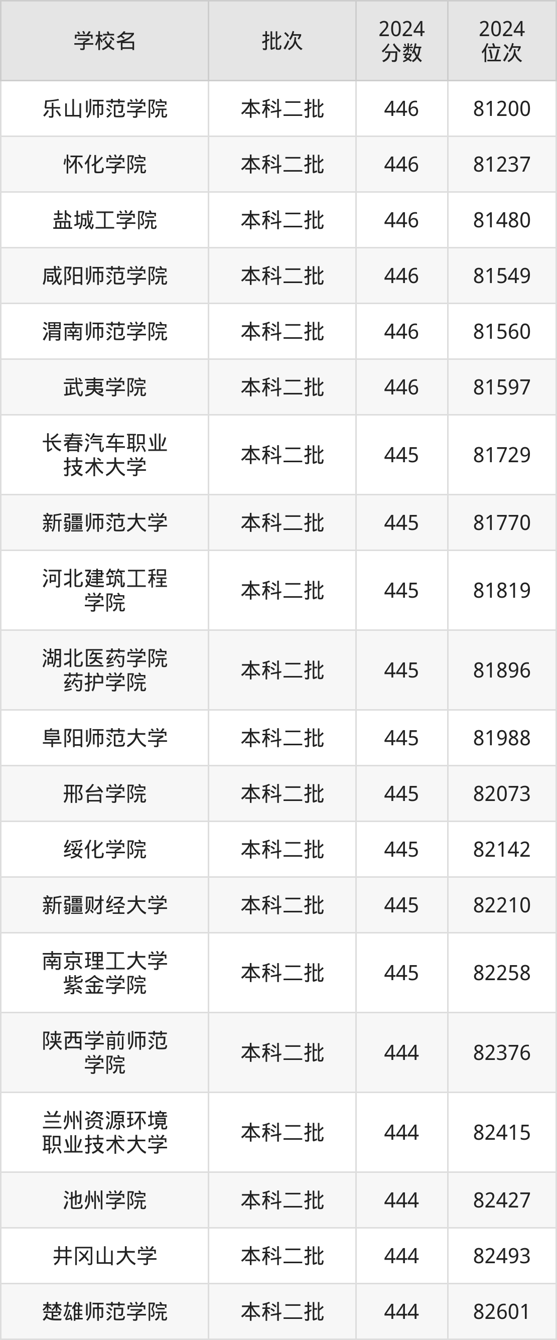 2024年陕西高考理科445分(81648名~82371名)能上的大学有河北建筑工程学院、邢台学院、长春汽车职业技术大学、绥化学院等。