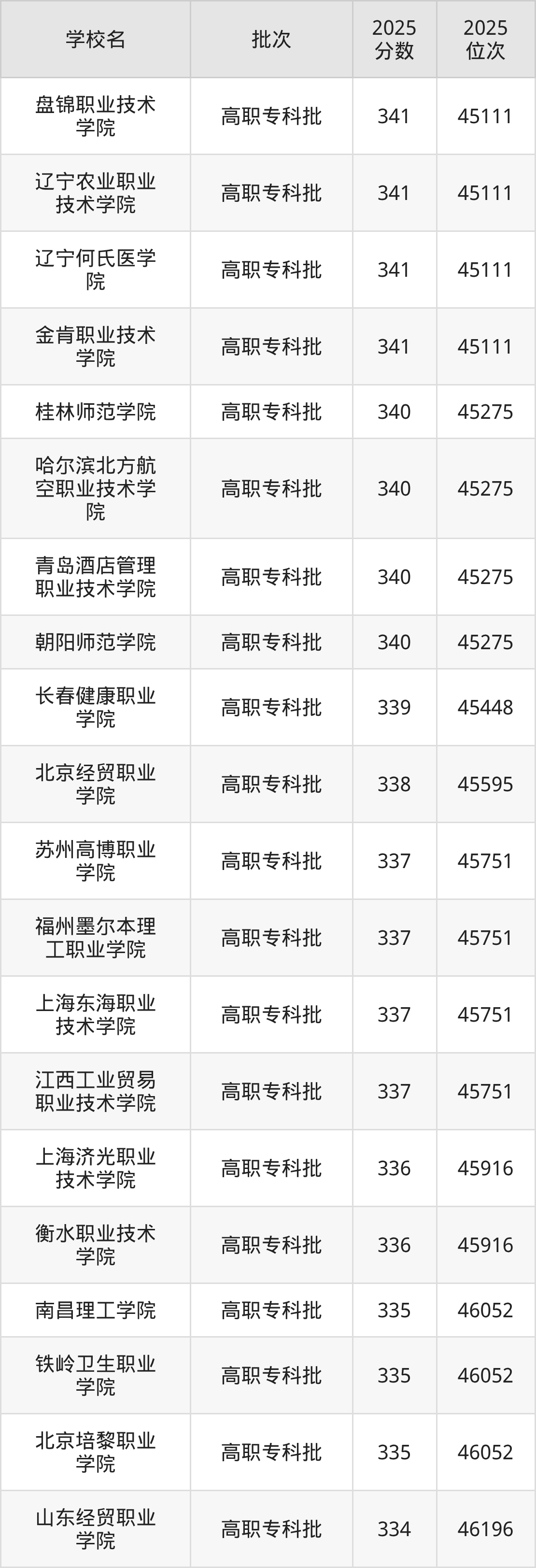 2025年辽宁高考历史类337分(45596名~45751名)能上的大学有苏州高博职业学院、江西工业贸易职业技术学院、上海东海职业技术学院、福州墨尔本理工职业学院。