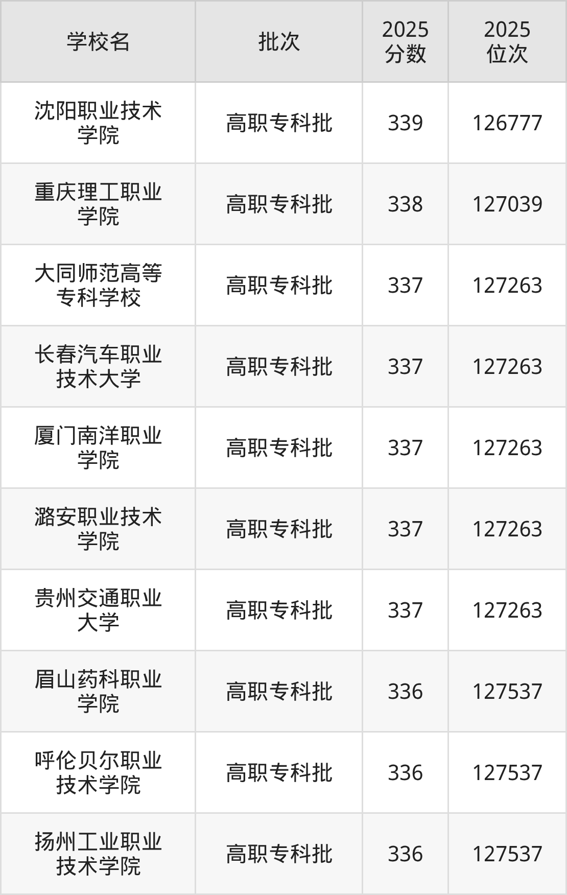 2025年辽宁高考物理类337分(127040名~127263名)能上的大学有厦门南洋职业学院、贵州交通职业大学、长春汽车职业技术大学、大同师范高等专科学校等。
