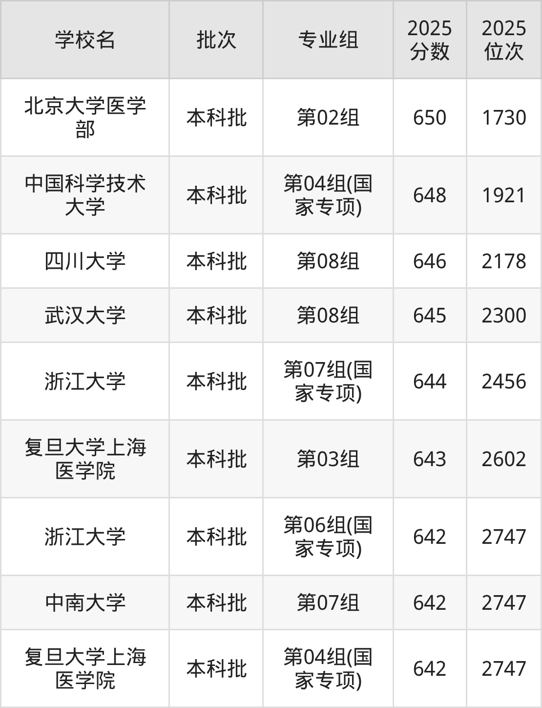 另外录取位次低于该区间(较稳妥)的有浙江大学第07组(国家专项)(2456名)、复旦大学上海医学院第03组(2602名)等;录取位次高于该区间(可冲)的有四川大学第08组(2178名)、中国科学技术大学第04组(国家专项)(1921名)等。