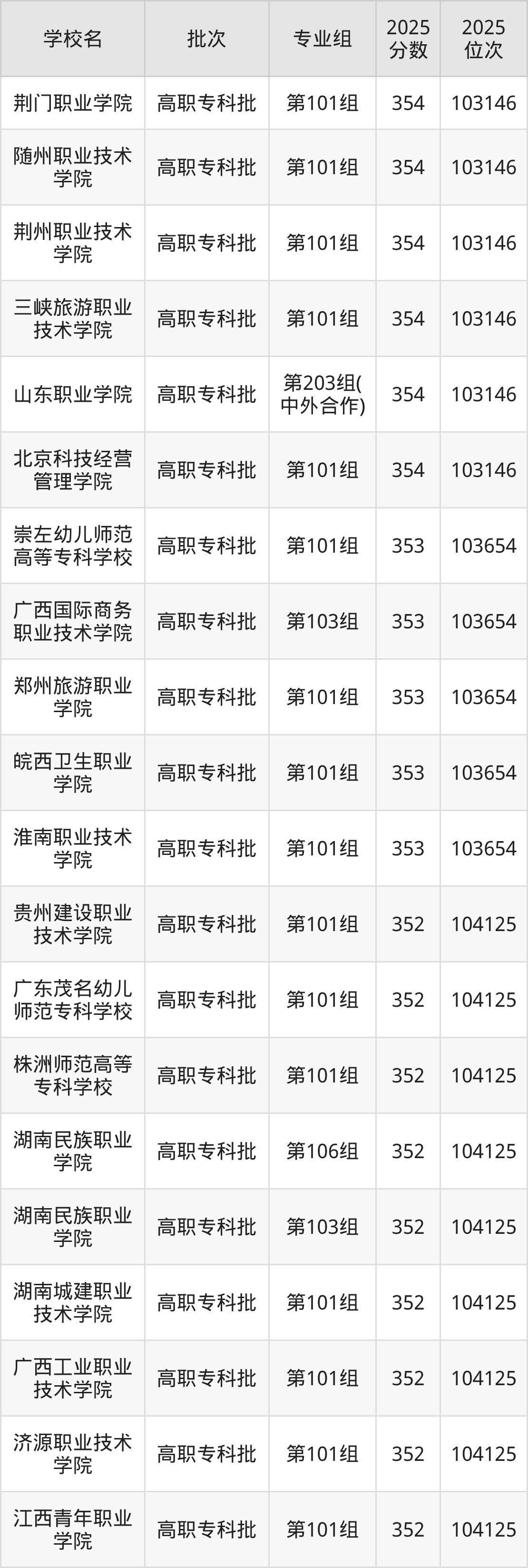 另外录取位次低于该区间(较稳妥)的有江西青年职业学院第101组(104125名)、贵州建设职业技术学院第101组(104125名)等;录取位次高于该区间(可冲)的有荆州职业技术学院第101组(103146名)、荆门职业学院第101组(103146名)等。