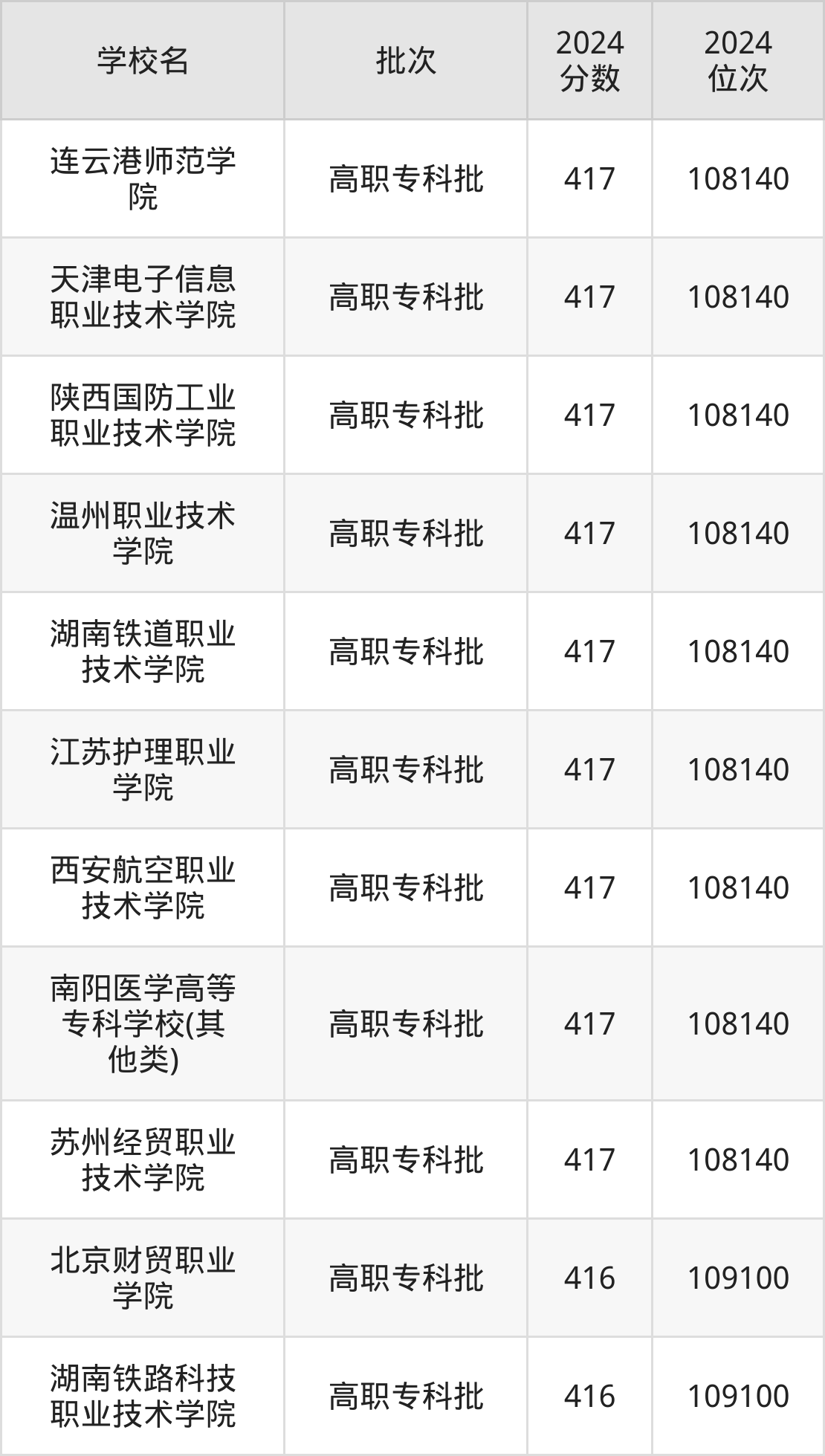 2024年河南高考文科416分(108141名~109100名)能上的大学有湖南铁路科技职业技术学院、北京财贸职业学院。