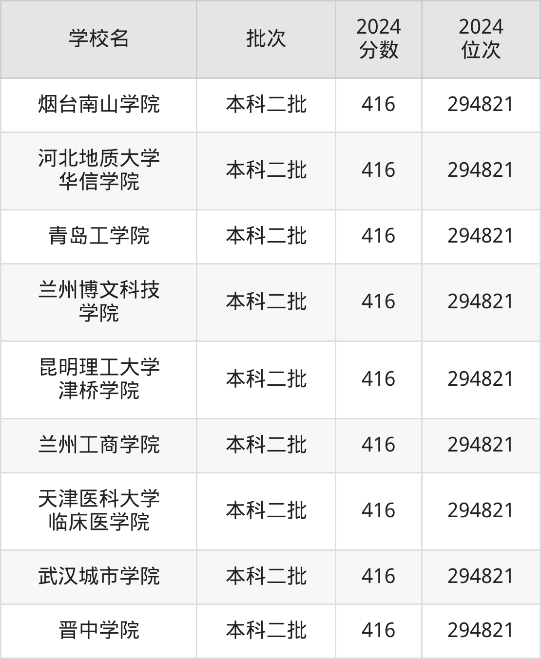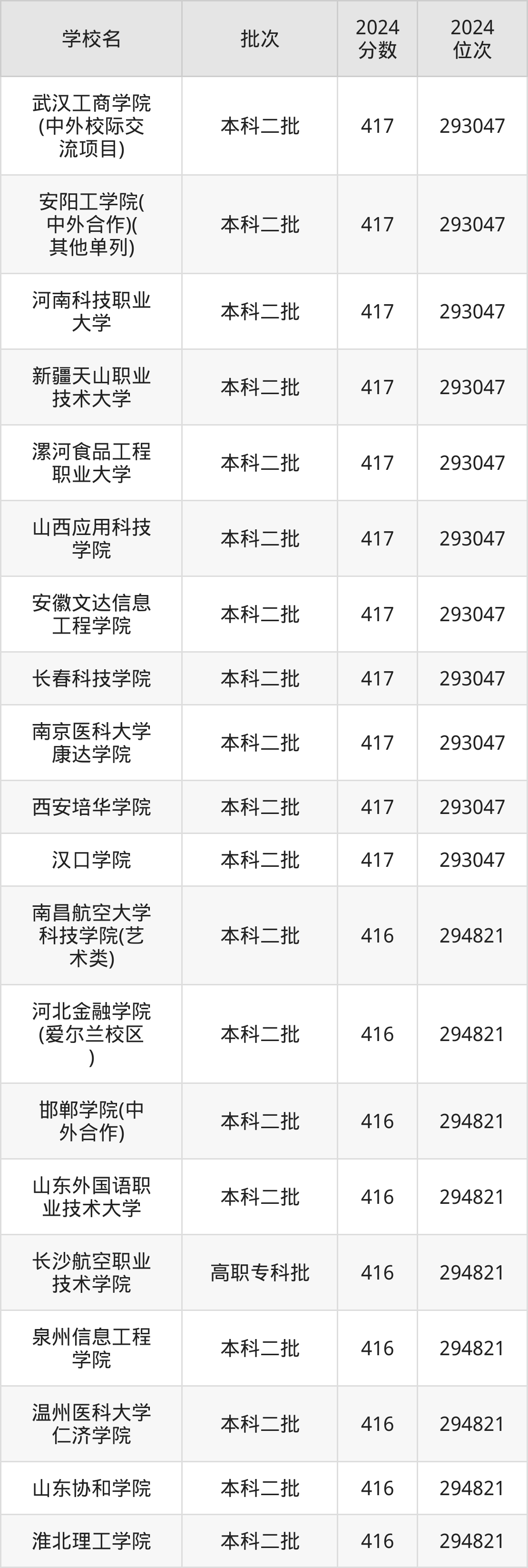 2024年河南高考理科416分(293049名~294822名)能上的大学有晋中学院、武汉城市学院、天津医科大学临床医学院、兰州工商学院等。