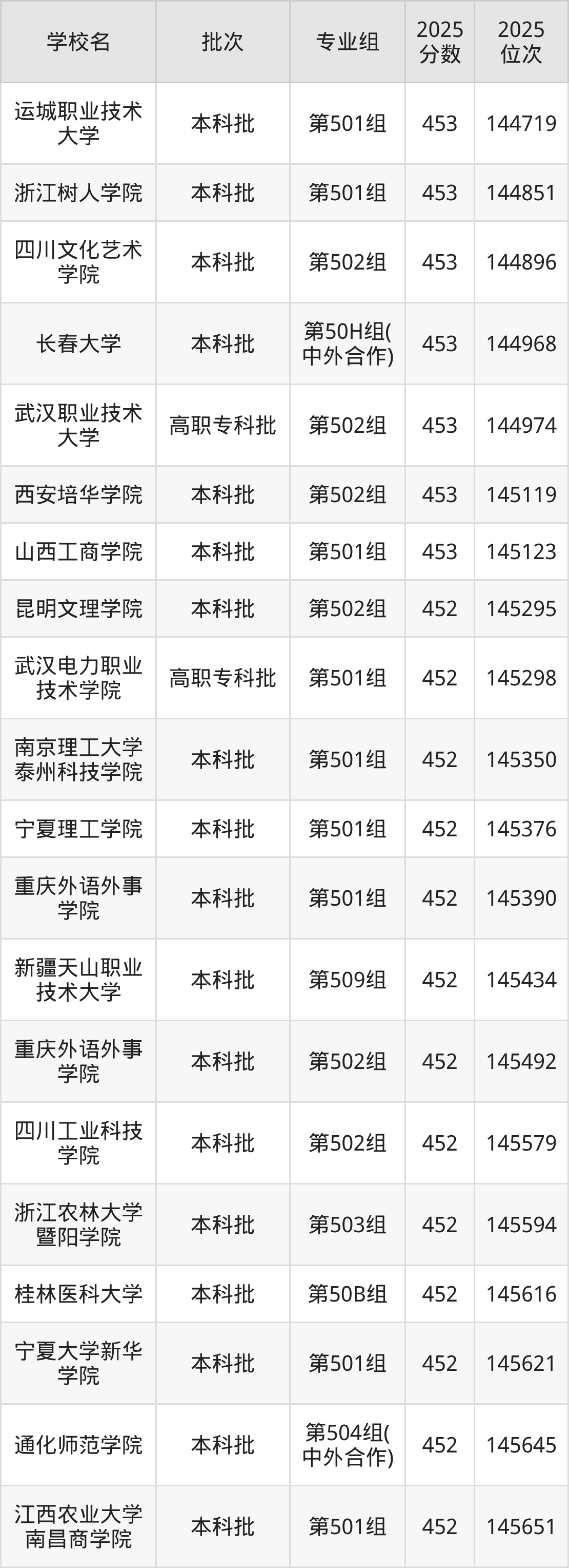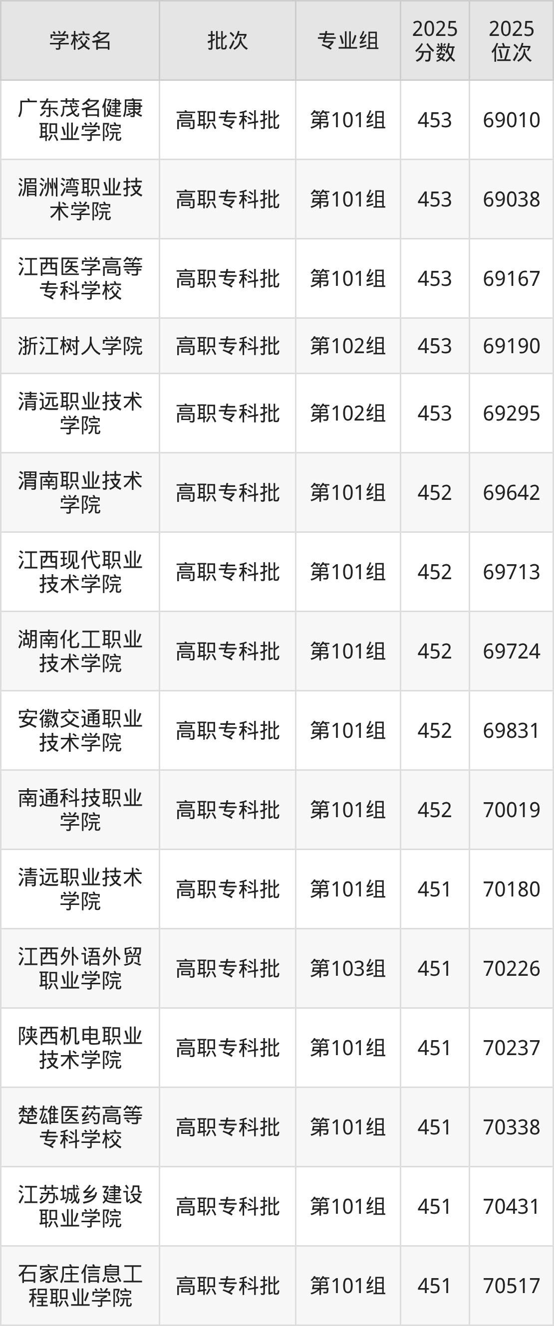2025年江西高考历史类452分(69481名~70087名)能上的大学有南通科技职业学院第101组、安徽交通职业技术学院第101组、湖南化工职业技术学院第101组、渭南职业技术学院第101组等。