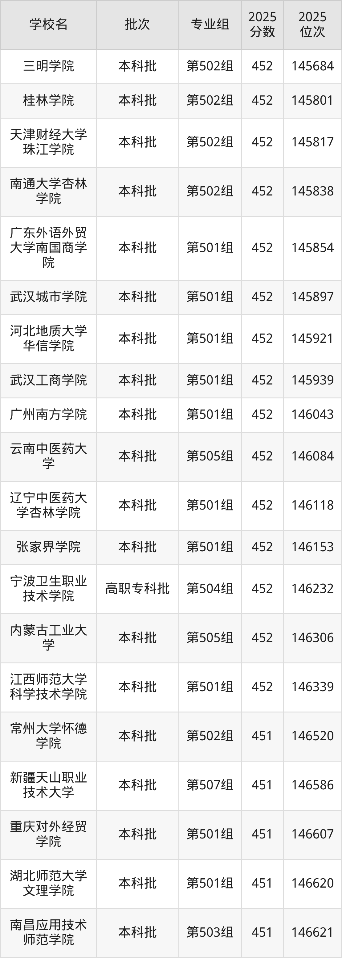 2025年江西高考物理类452分(145215名~146429名)能上的大学有内蒙古工业大学第505组、通化师范学院第504组(中外合作)、三明学院第502组、桂林医科大学第50B组等。