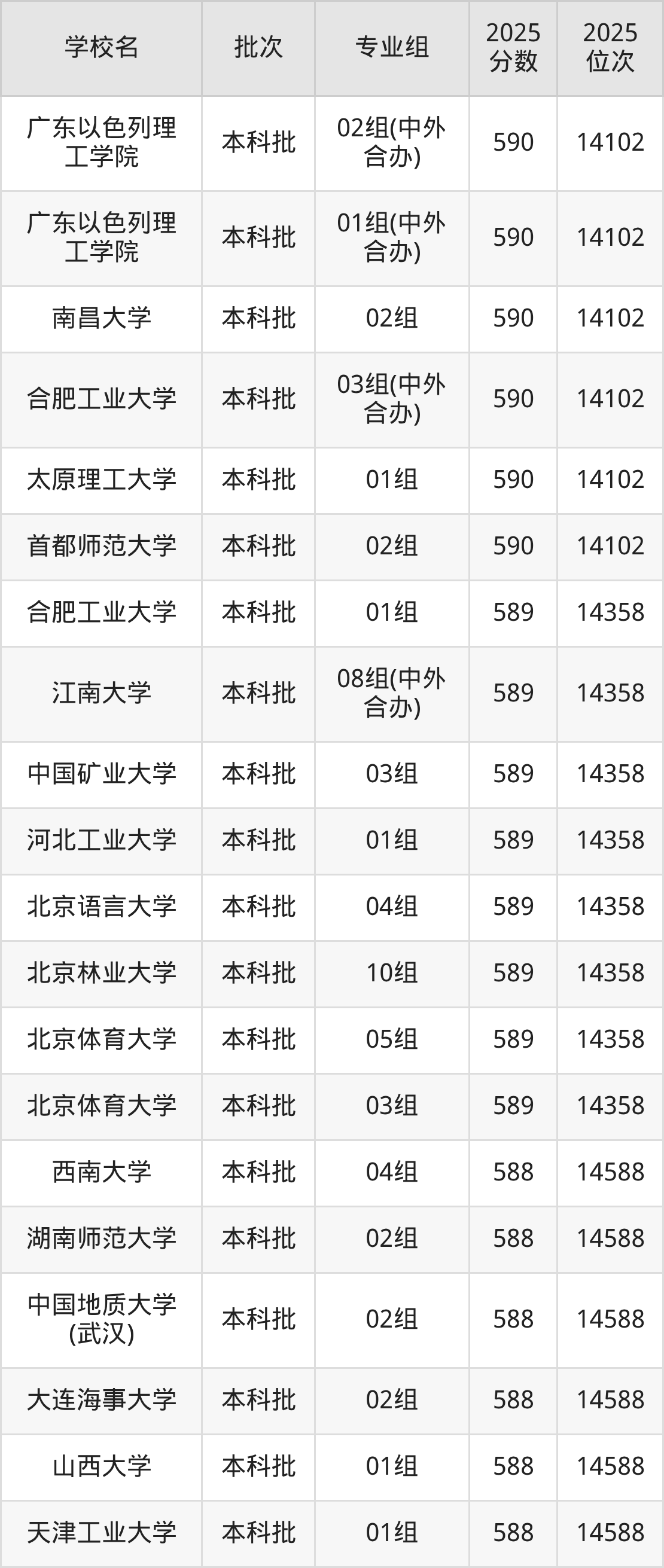 2025年北京高考590分(13898名~14102名)能上的大学有首都师范大学02组、太原理工大学01组、合肥工业大学03组(中外合办)、南昌大学02组等。