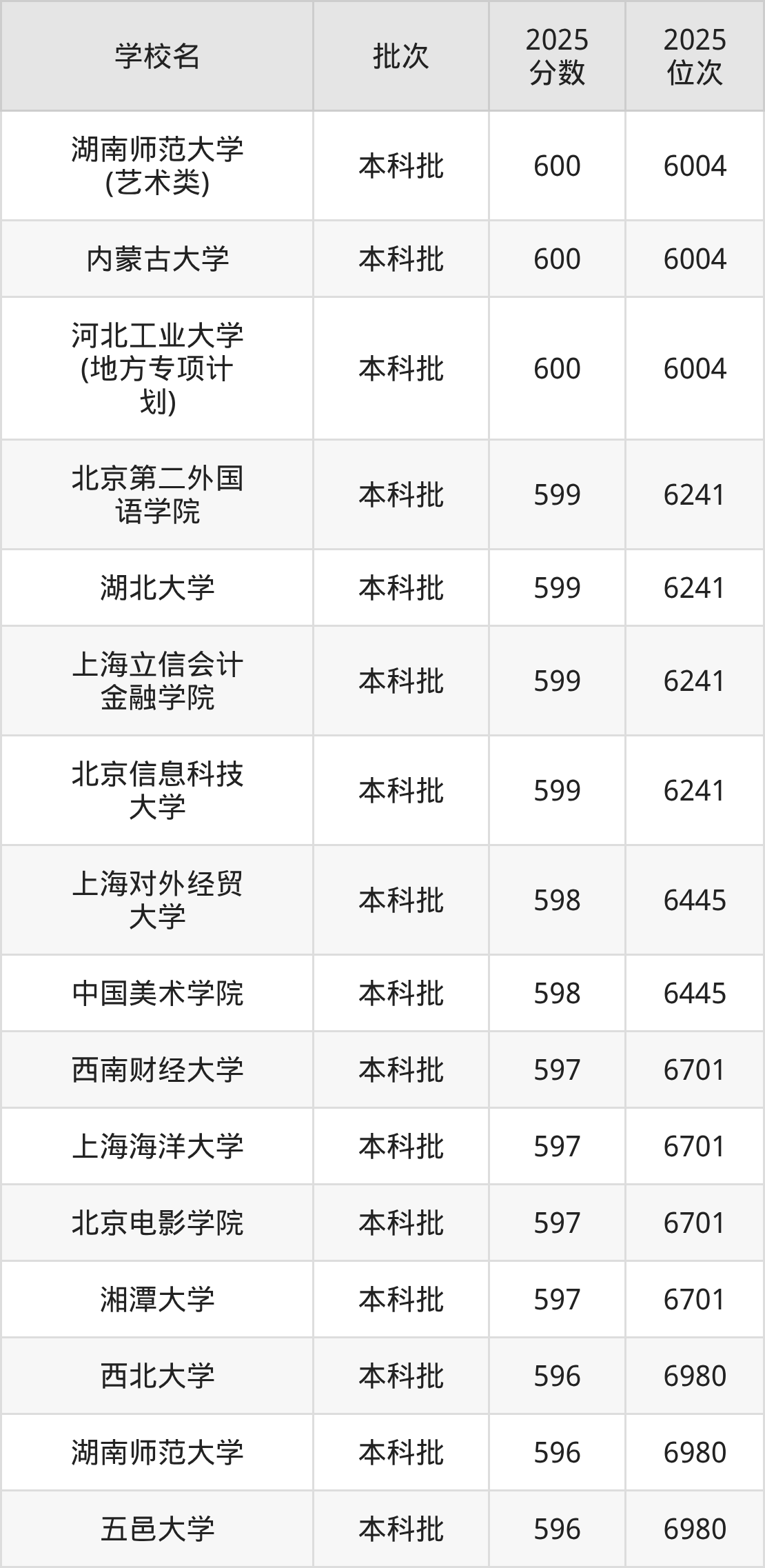 2025年河北高考历史类597分(6446名~6701名)能上的大学有西南财经大学、上海海洋大学、北京电影学院、湘潭大学。