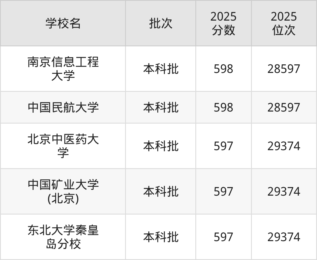 2025年河北高考物理类597分(28598名~29374名)能上的大学有东北大学秦皇岛分校、中国矿业大学(北京)、北京中医药大学。
