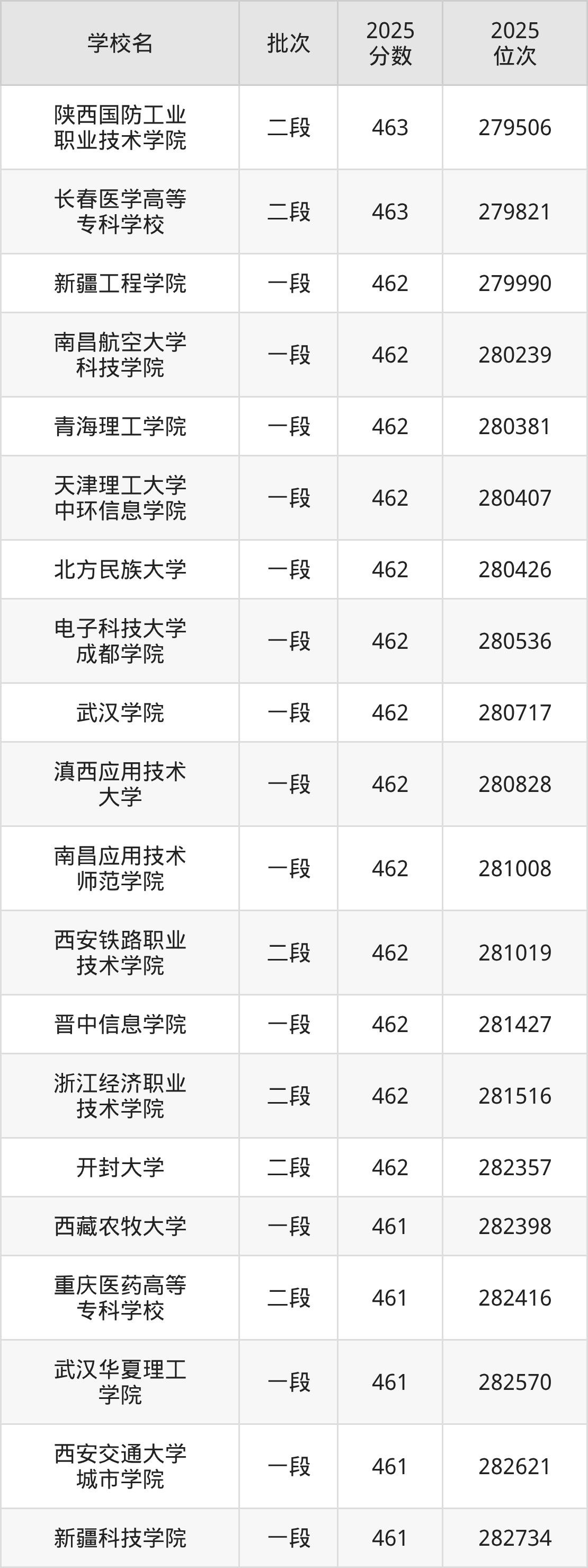 2025年山东高考462分(279880名~282367名)能上的大学有西安铁路职业技术学院、晋中信息学院、青海理工学院、武汉学院等。