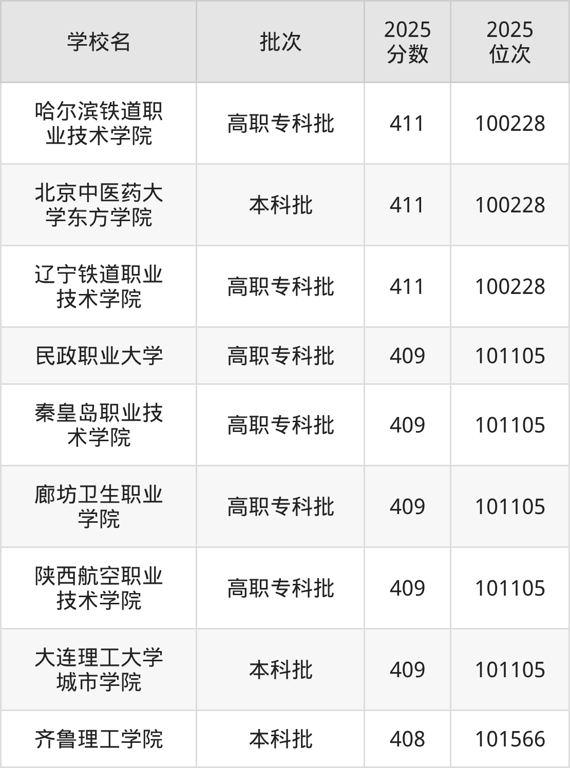 2025年辽宁高考物理类409分(100688名~101105名)能上的大学有民政职业大学、陕西航空职业技术学院、廊坊卫生职业学院、秦皇岛职业技术学院等。