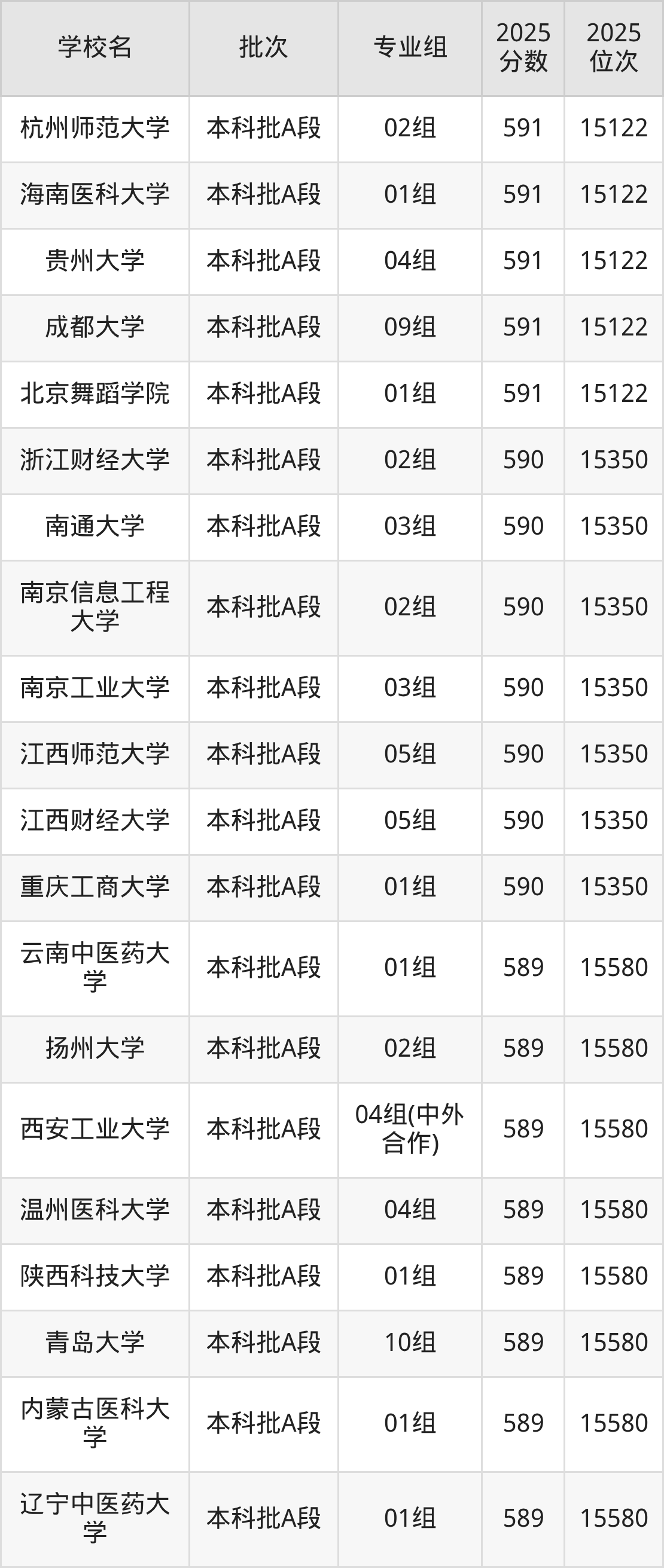 天津高考589分:排名15580位。该分数位次对应能上的大学有东北林业大学03组(中外合作)、广州中医药大学02组、哈尔滨医科大学05组、黑龙江中医药大学01组,更多名单如下文所示,2026届考生可参考。