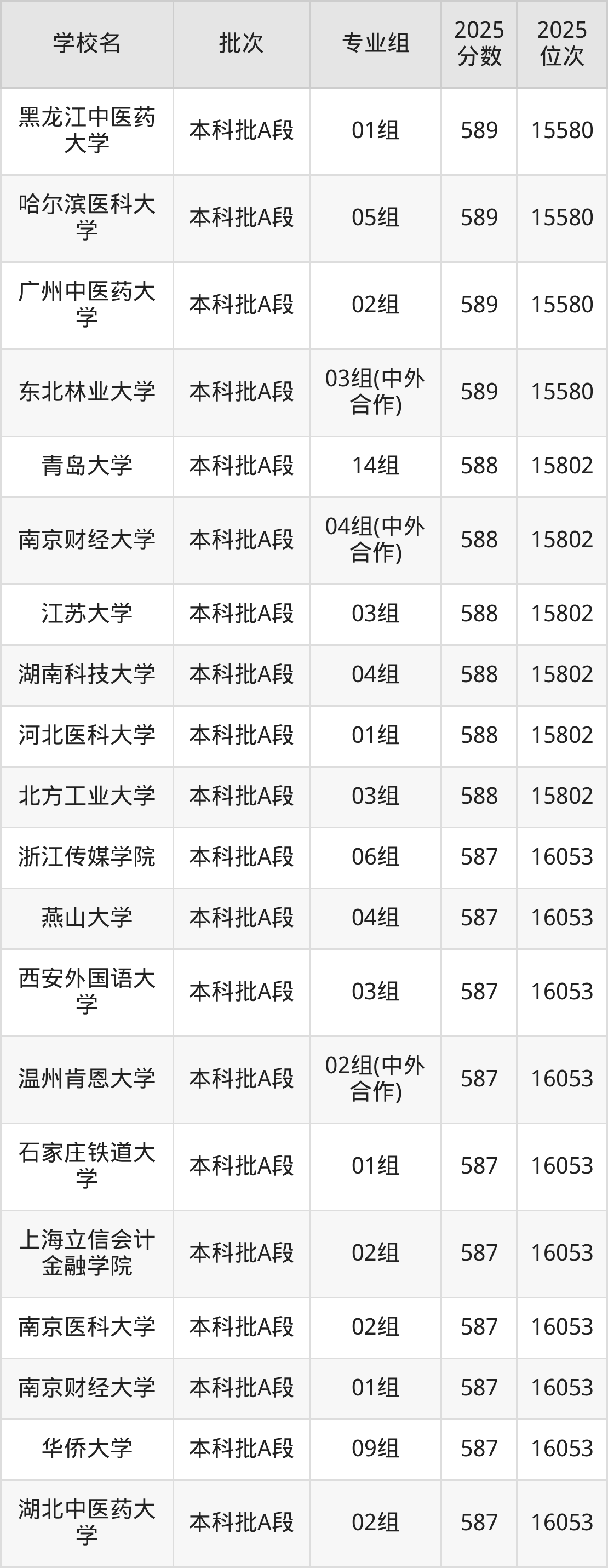 2025年天津高考589分(15351名~15580名)能上的大学有东北林业大学03组(中外合作)、广州中医药大学02组、哈尔滨医科大学05组、黑龙江中医药大学01组等。