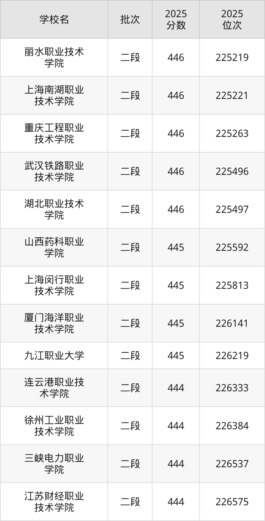 2025年浙江高考445分(225500名~226282名)能上的大学有厦门海洋职业技术学院、上海闵行职业技术学院、九江职业大学、山西药科职业学院。