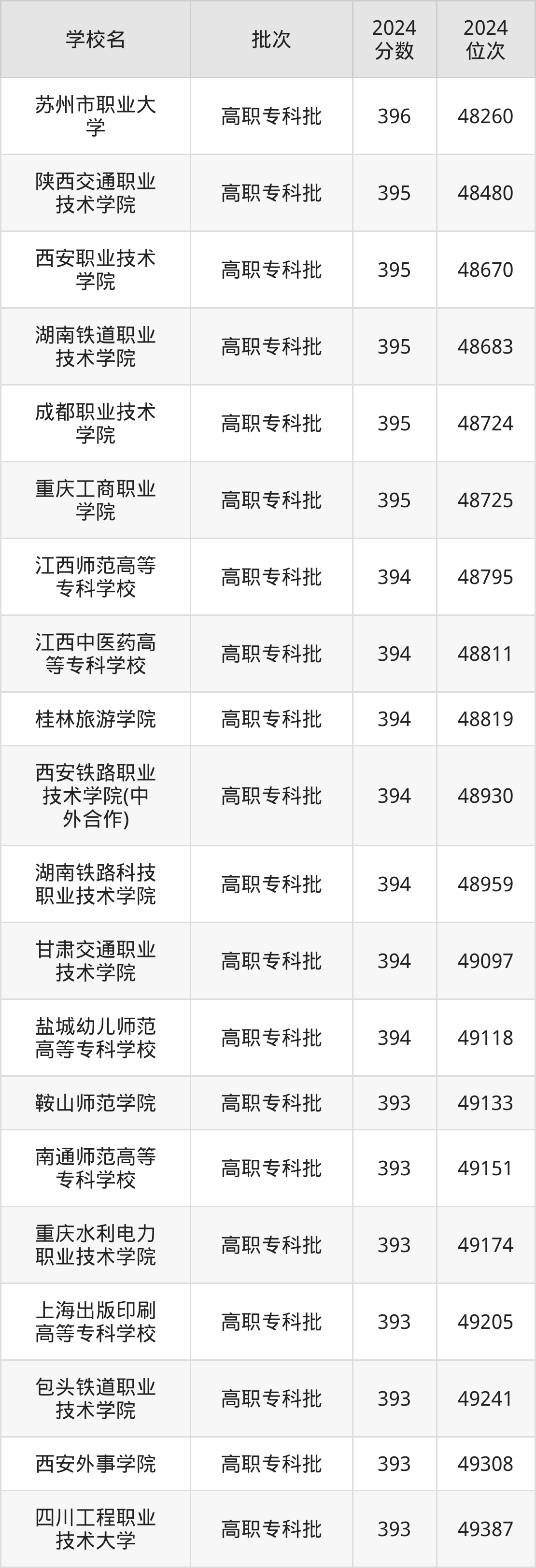 2024年陕西高考文科394分(48760名~49125名)能上的大学有盐城幼儿师范高等专科学校、江西中医药高等专科学校、江西师范高等专科学校、湖南铁路科技职业技术学院等。