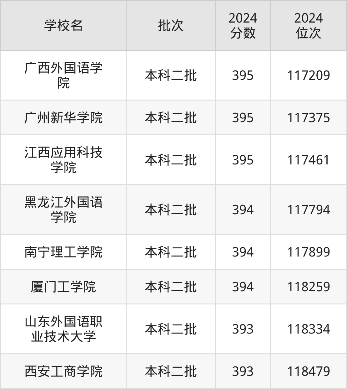 2024年陕西高考理科394分(117611名~118268名)能上的大学有黑龙江外国语学院、厦门工学院、南宁理工学院。