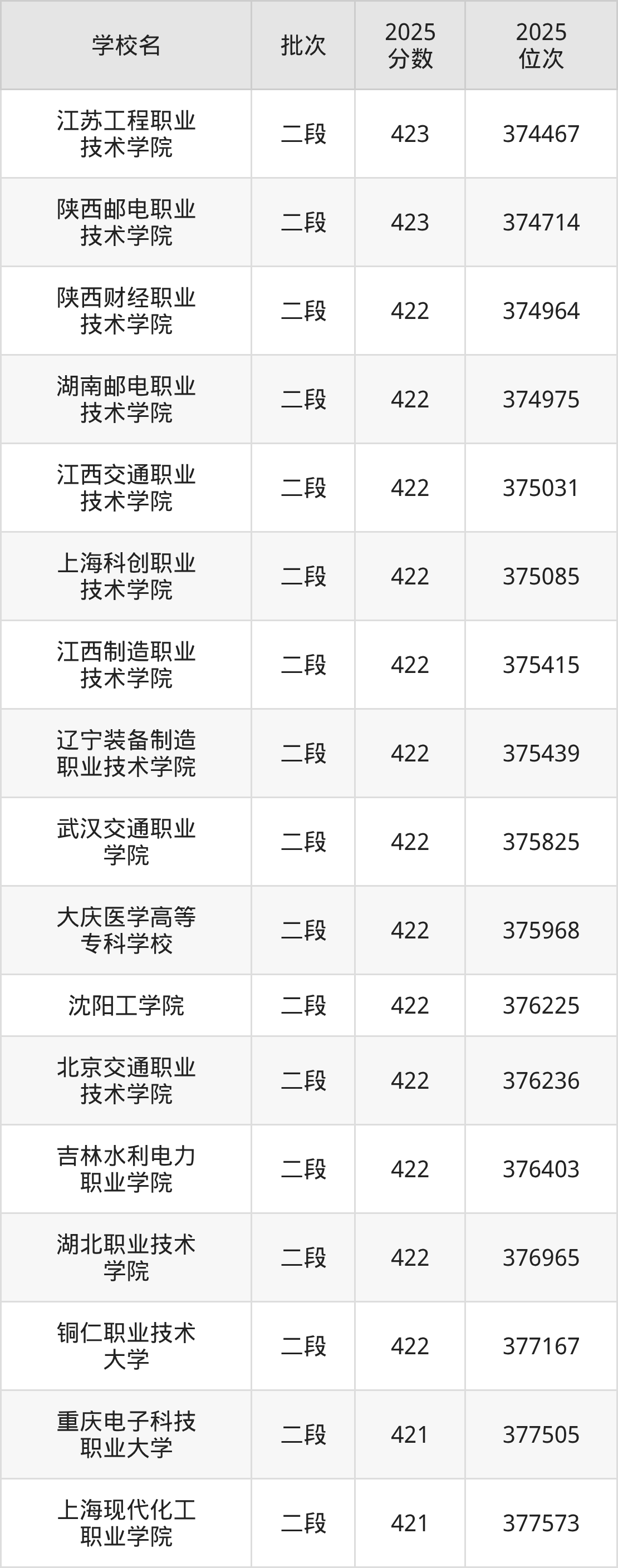 这些都是2026年高考374923名~377206名考生可以报考的大学,更多学校名单如下表所示: