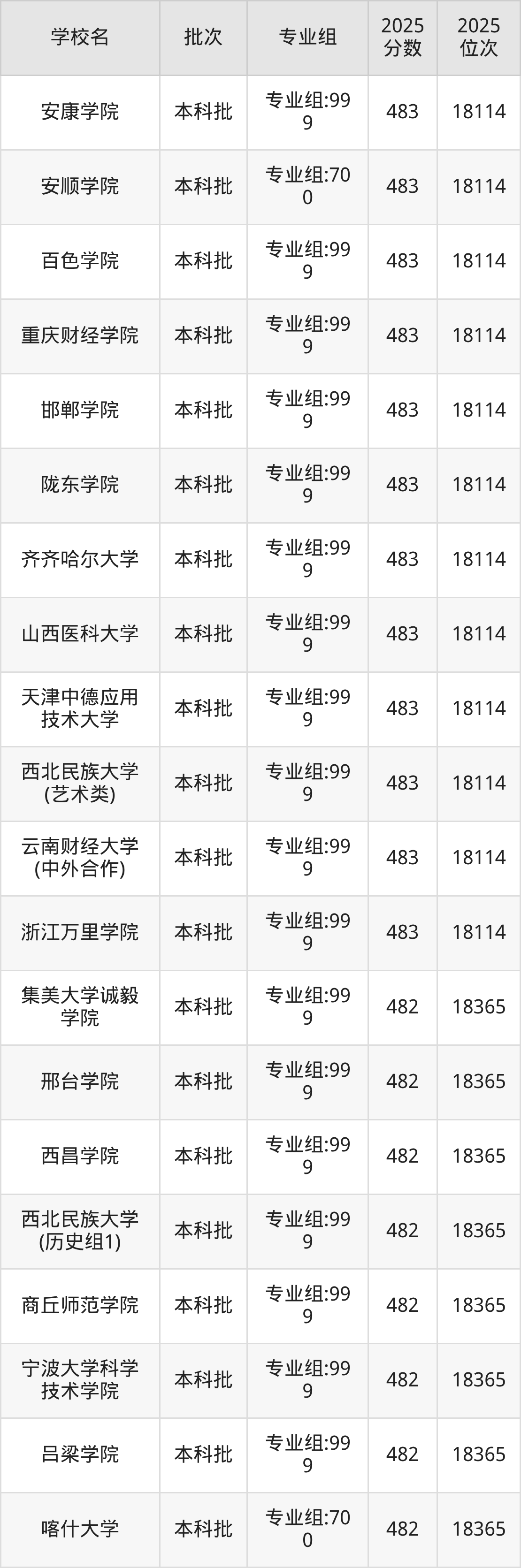 另外录取位次低于该区间(较稳妥)的有太原工业学院专业组:999(18810名)、四川传媒学院专业组:999(18810名)等;录取位次高于该区间(可冲)的有西北民族大学(历史组1)专业组:999(18365名)、邢台学院专业组:999(18365名)等。