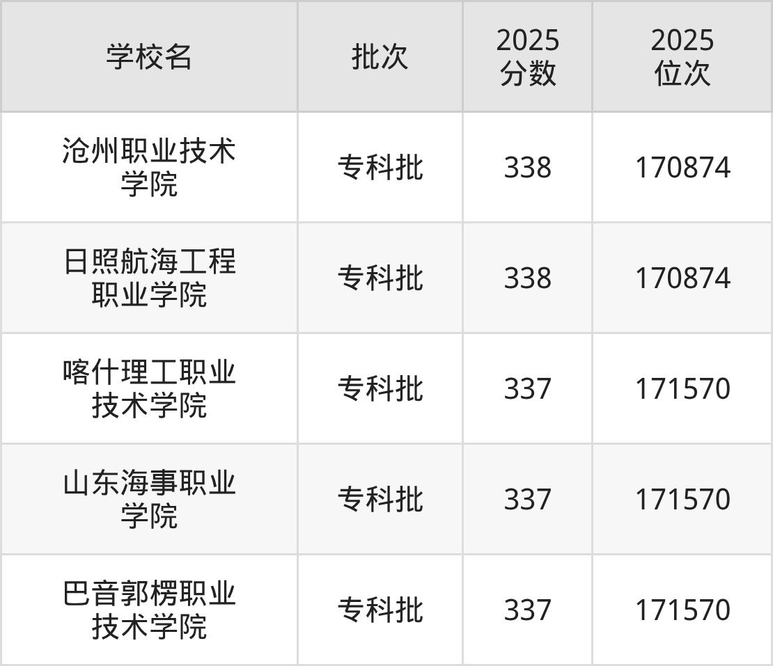 2025年河北高考历史类337分(170875名~171570名)能上的大学有巴音郭楞职业技术学院、山东海事职业学院、喀什理工职业技术学院。