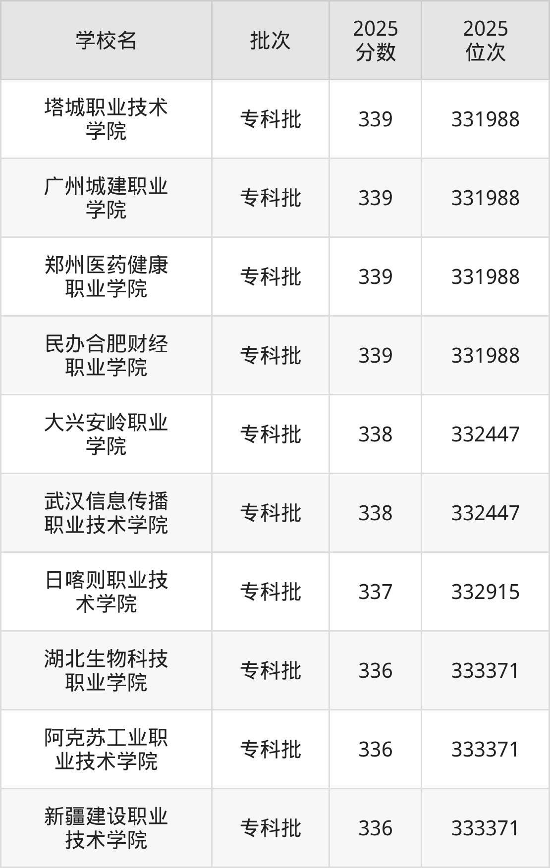 另外录取位次低于该区间(较稳妥)的有新疆建设职业技术学院(333371名)、阿克苏工业职业技术学院(333371名)等;录取位次高于该区间(可冲)的有大兴安岭职业学院(332447名)、武汉信息传播职业技术学院(332447名)等。