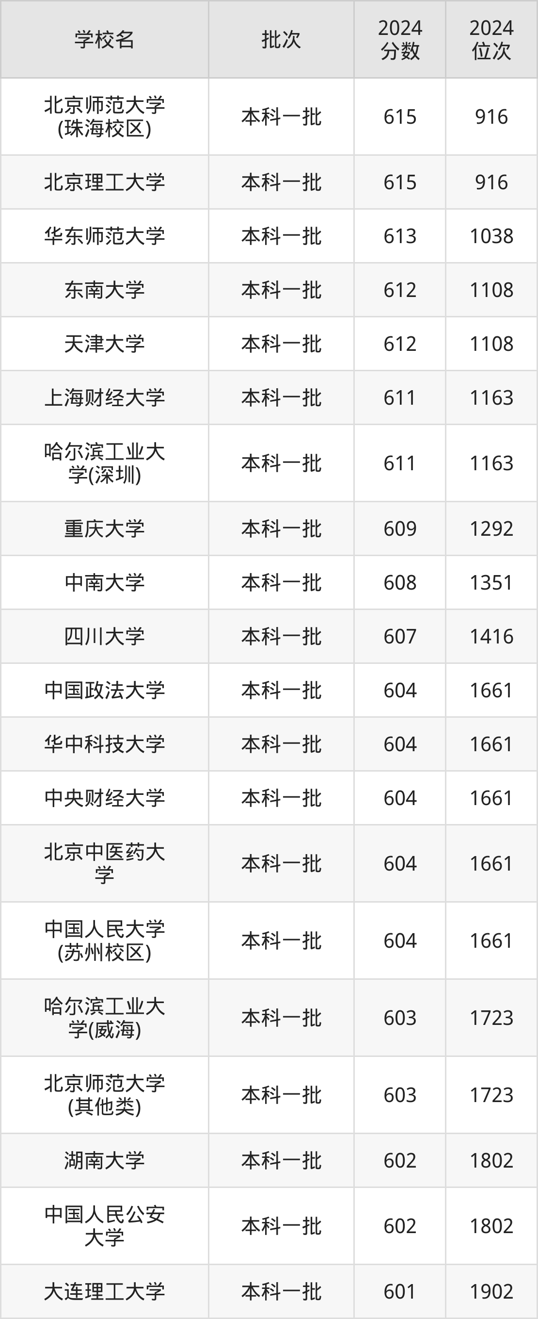 这些都是2025年高考文科1352名~1416名考生可以报考的大学,更多学校名单如下表所示: