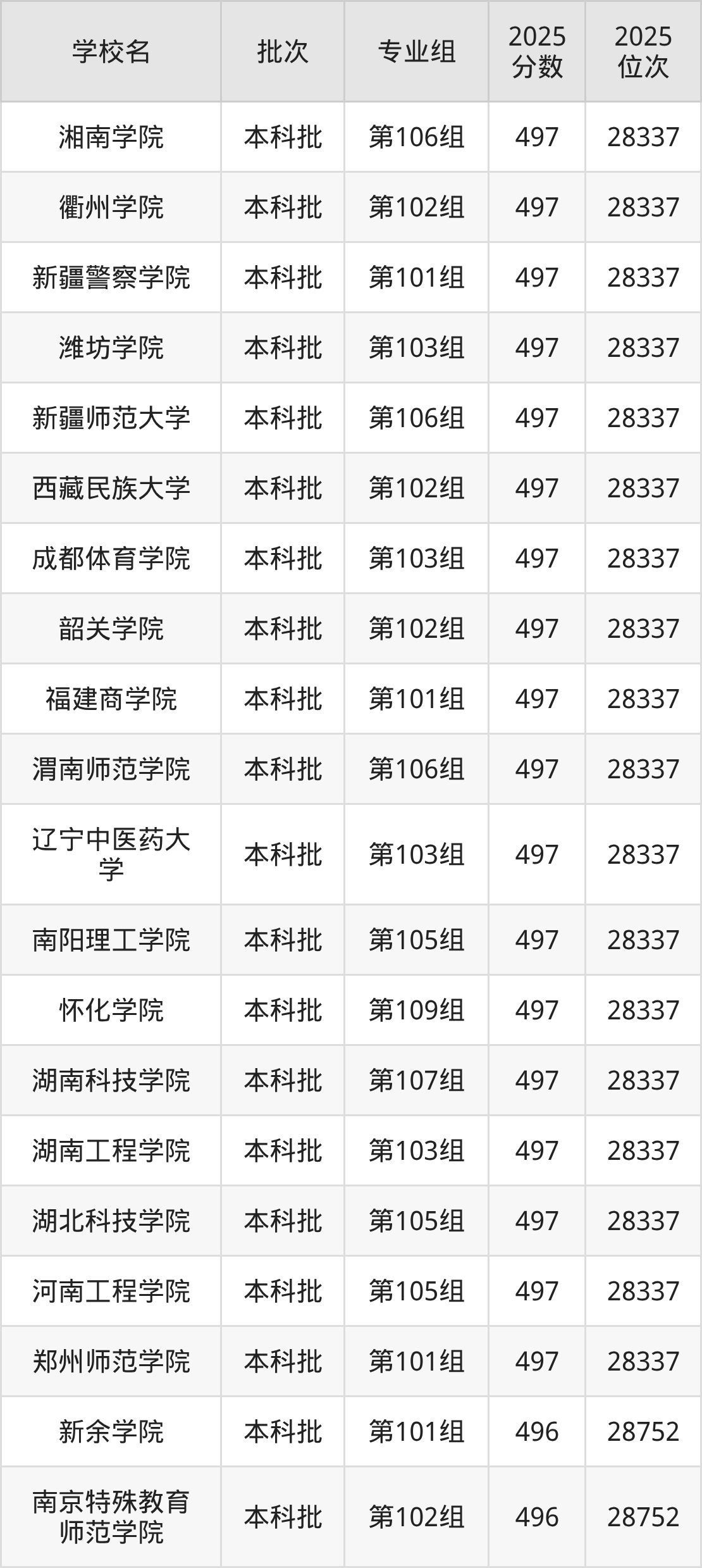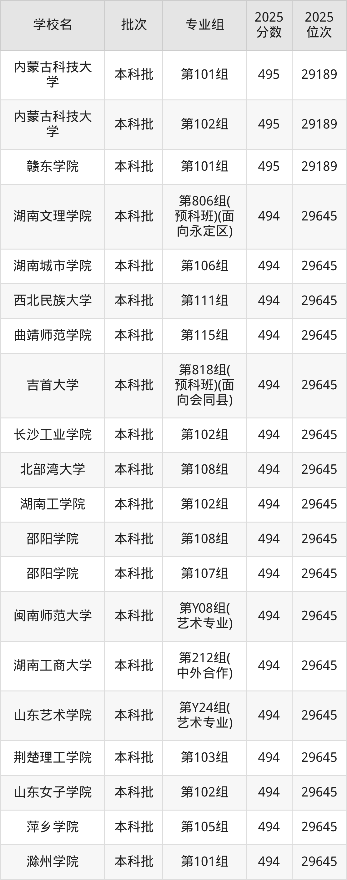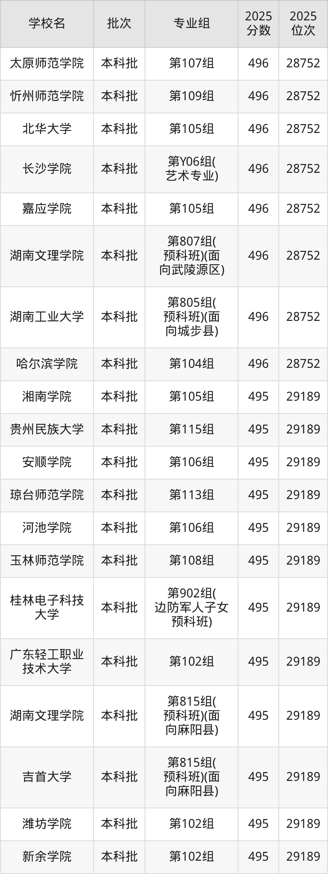 2025年湖南高考历史类495分(28753名~29189名)能上的大学有内蒙古科技大学第101组、内蒙古科技大学第102组、赣东学院第101组、新余学院第102组等。