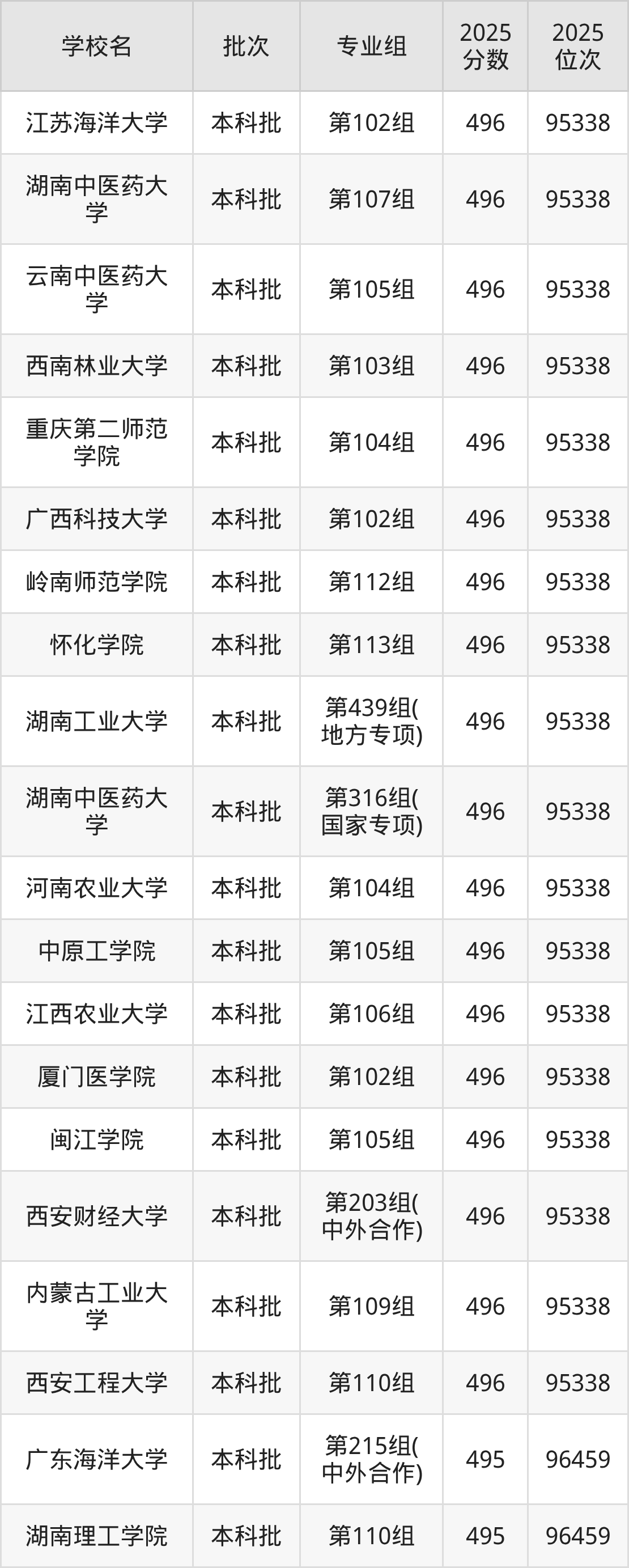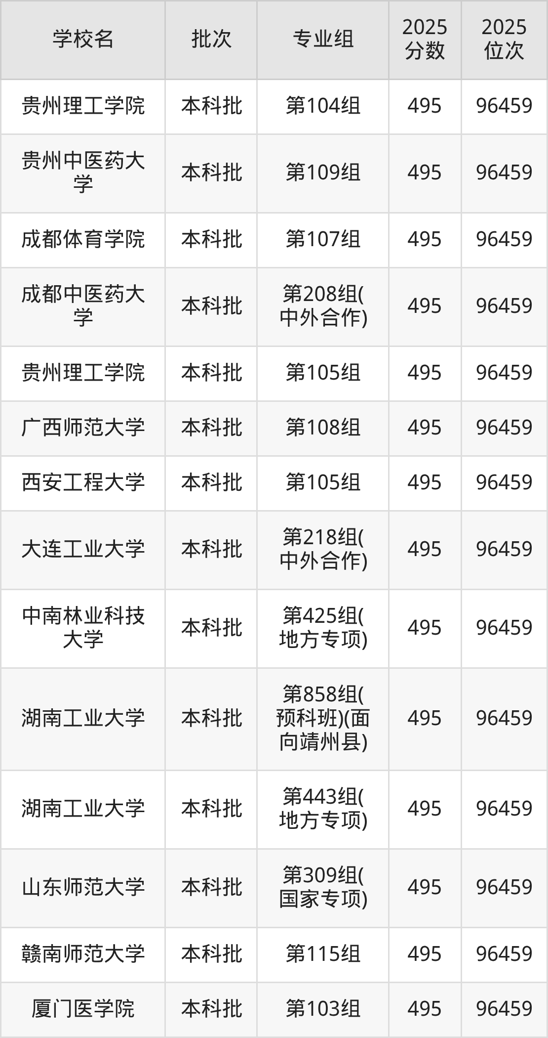 2025年湖南高考物理类495分(95339名~96459名)能上的大学有大连工业大学第218组(中外合作)、厦门医学院第103组、赣南师范大学第115组、山东师范大学第309组(国家专项)等。