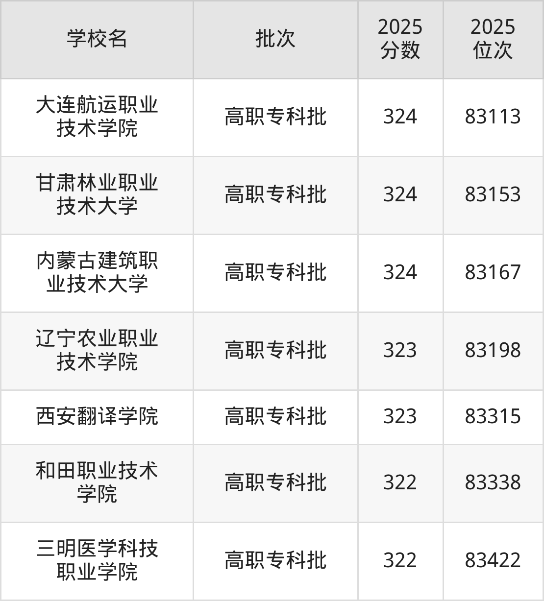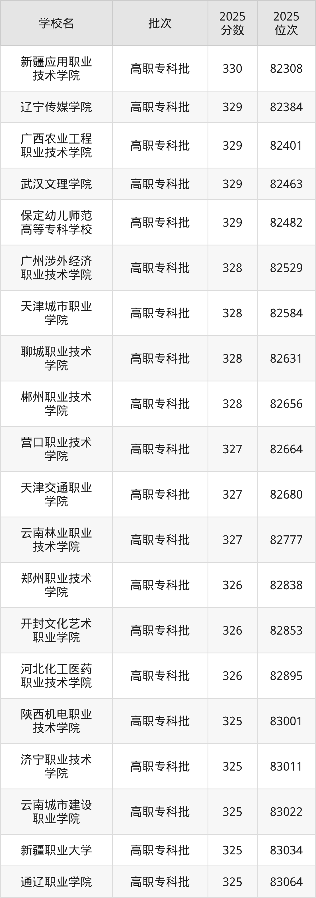 另外录取位次低于该区间(较稳妥)的有陕西机电职业技术学院(83001名)、济宁职业技术学院(83011名)等;录取位次高于该区间(可冲)的有云南林业职业技术学院(82777名)、天津交通职业学院(82680名)等。