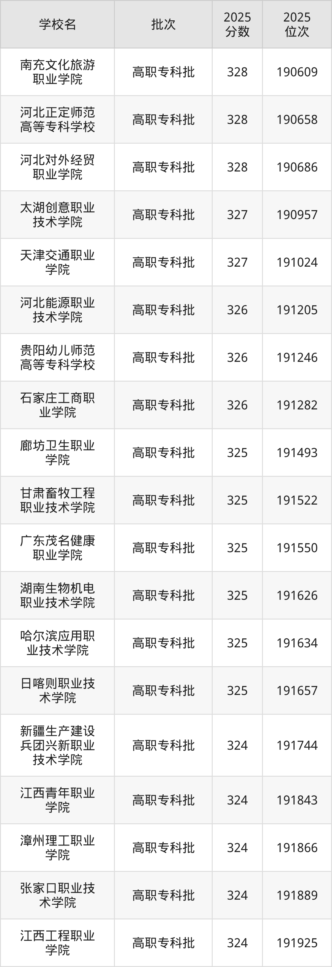 2025年贵州高考物理类326分(191093名~191425名)能上的大学有贵阳幼儿师范高等专科学校、河北能源职业技术学院、石家庄工商职业学院。