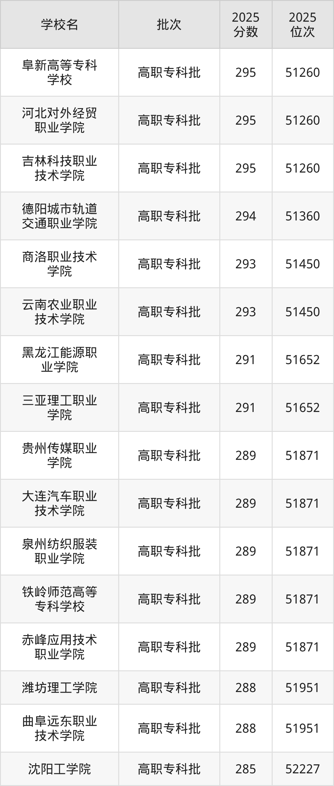 2025年辽宁高考历史类290分(51653名~51754名)录取位次低于该区间(较稳妥)的有铁岭师范高等专科学校(51871名)、贵州传媒职业学院(51871名)等;录取位次高于该区间(可冲)的有三亚理工职业学院(51652名)、黑龙江能源职业学院(51652名)等。