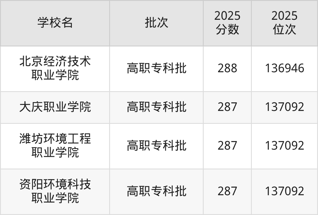 另外录取位次低于该区间(较稳妥)的有云南新兴职业学院(136808名)、辽宁石化职业技术学院(136808名)等;录取位次高于该区间(可冲)的有合肥科技职业学院(136535名)、阿克苏职业技术学院(136392名)等。