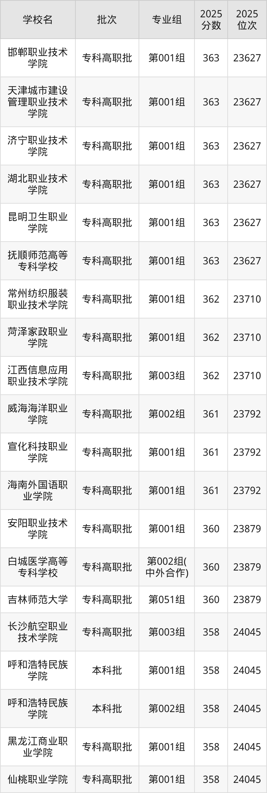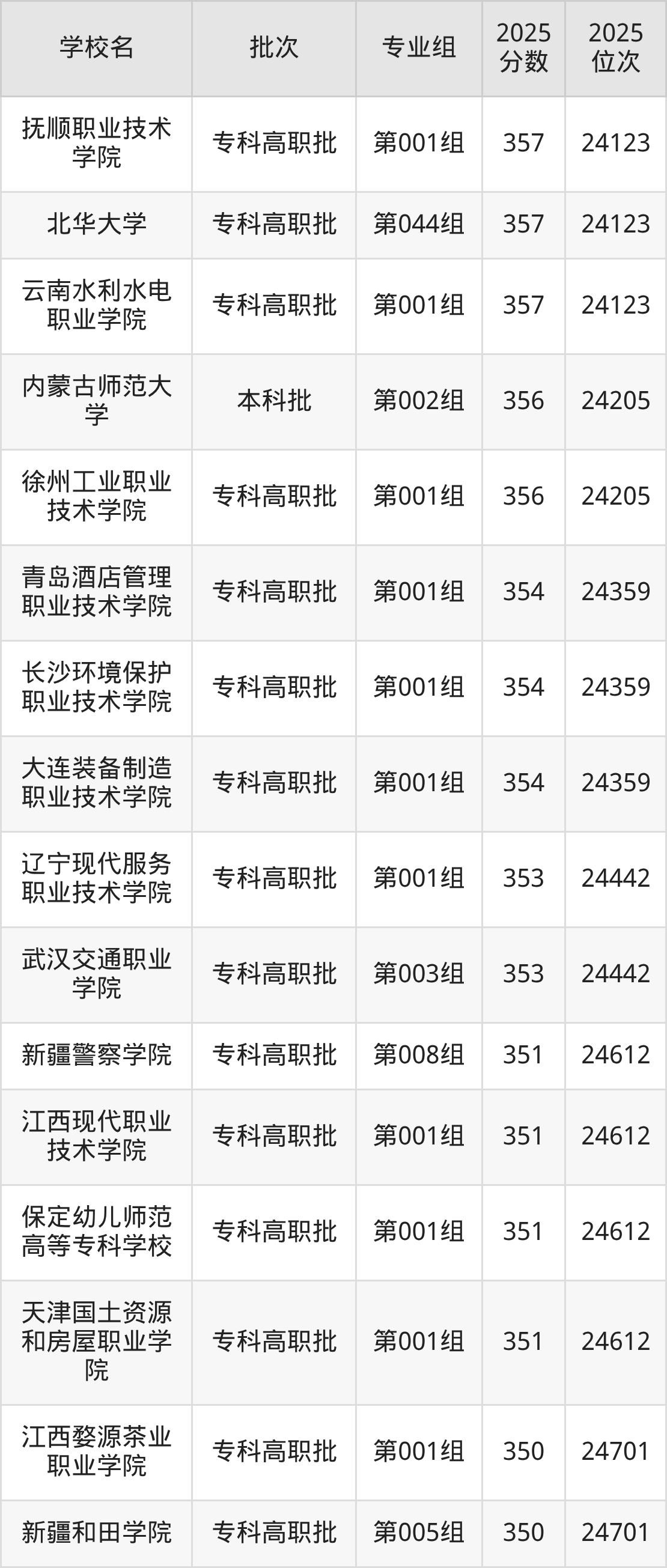 2025年吉林高考历史类356分(24124名~24205名)能上的大学有内蒙古师范大学第002组、徐州工业职业技术学院第001组。