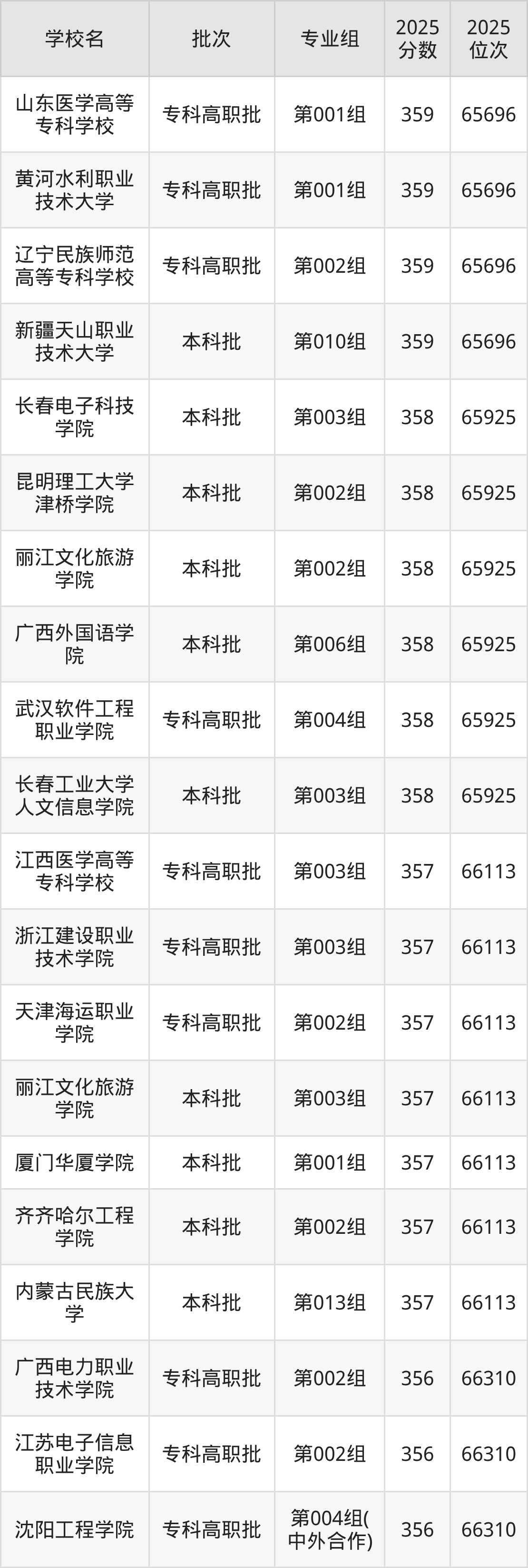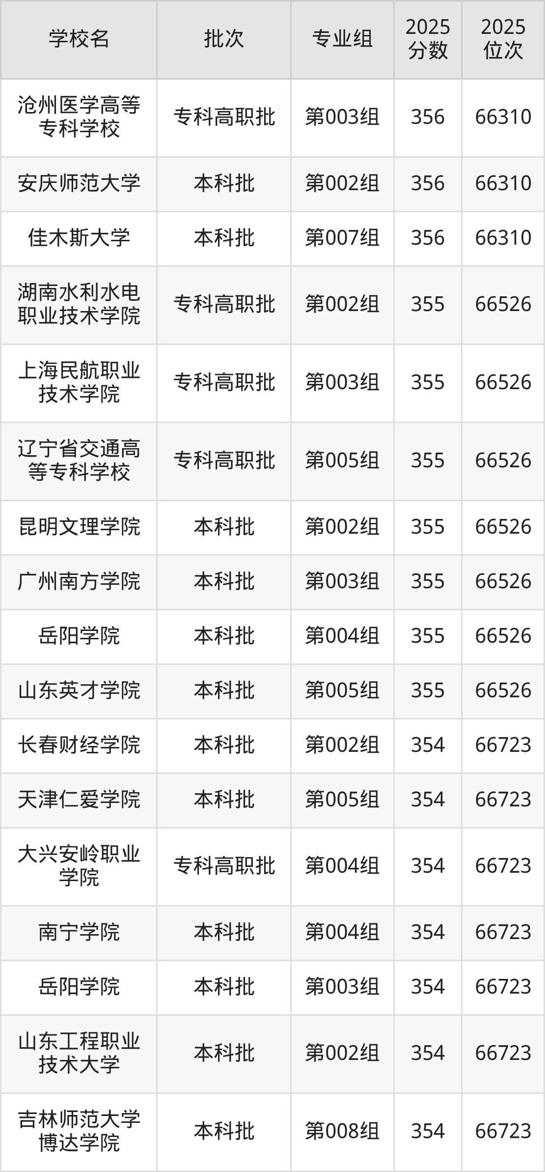 2025年吉林高考物理类356分(66114名~66310名)能上的大学有佳木斯大学第007组、安庆师范大学第002组、沧州医学高等专科学校第003组、沈阳工程学院第004组(中外合作)等。