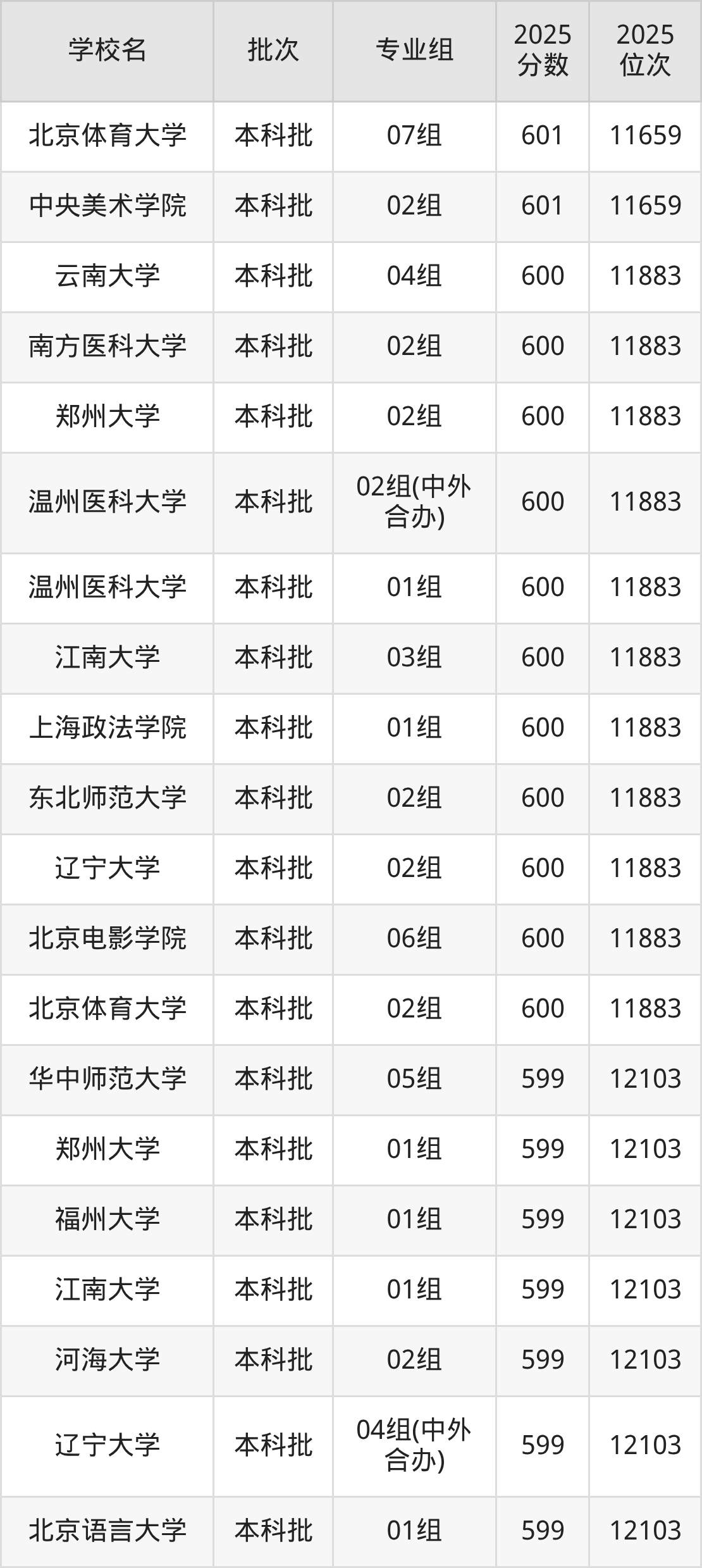 2025年北京高考600分(11660名~11883名)能上的大学有北京体育大学02组、北京电影学院06组、辽宁大学02组、东北师范大学02组等。