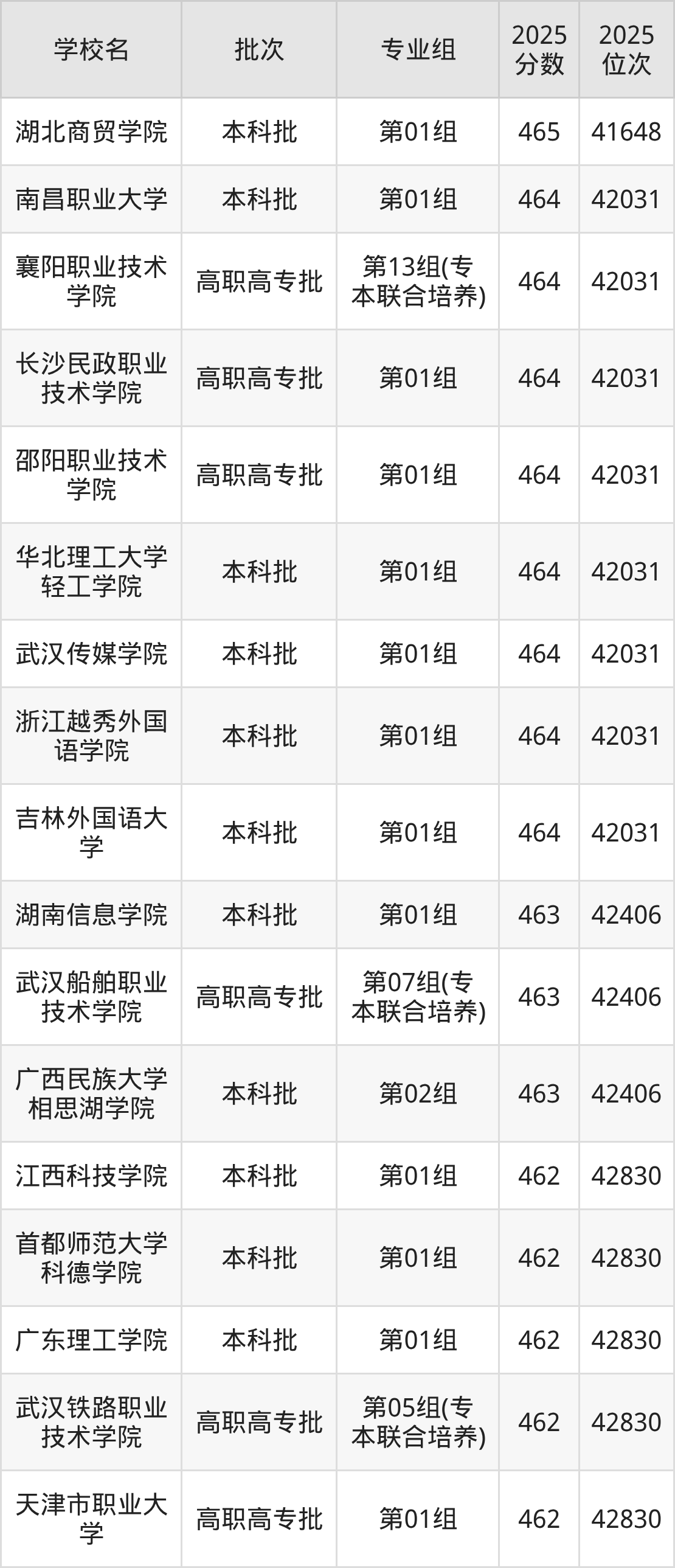 2025年湖北高考历史类463分(42032名~42406名)能上的大学有湖南信息学院第01组、广西民族大学相思湖学院第02组、武汉船舶职业技术学院第07组(专本联合培养)。