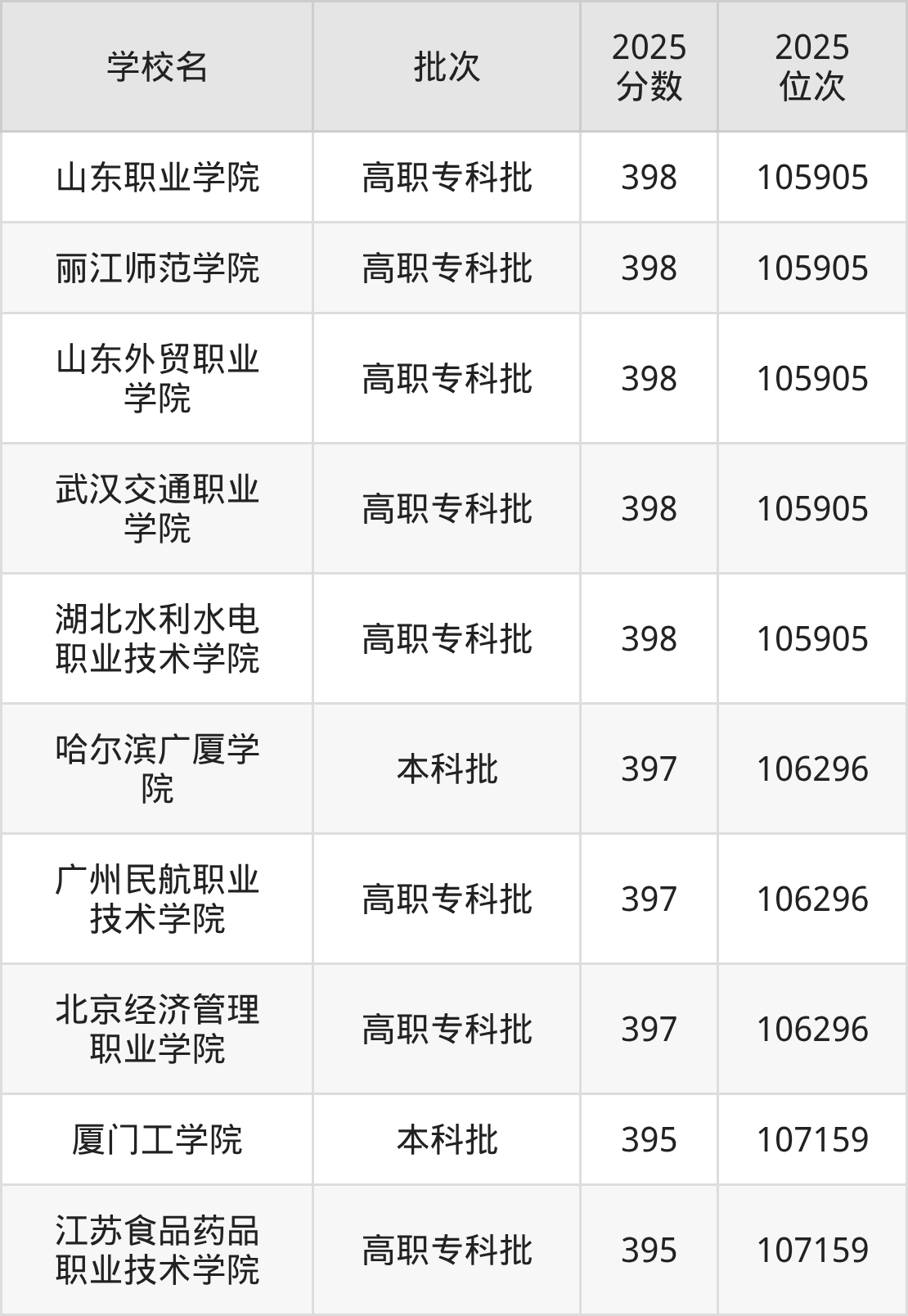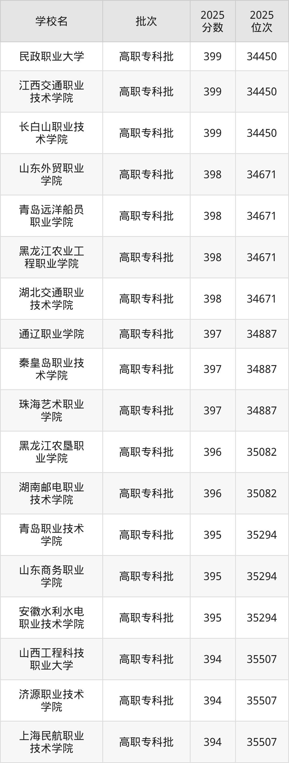 2025年辽宁高考历史类396分(34888名~35082名)能上的大学有湖南邮电职业技术学院、黑龙江农垦职业学院。