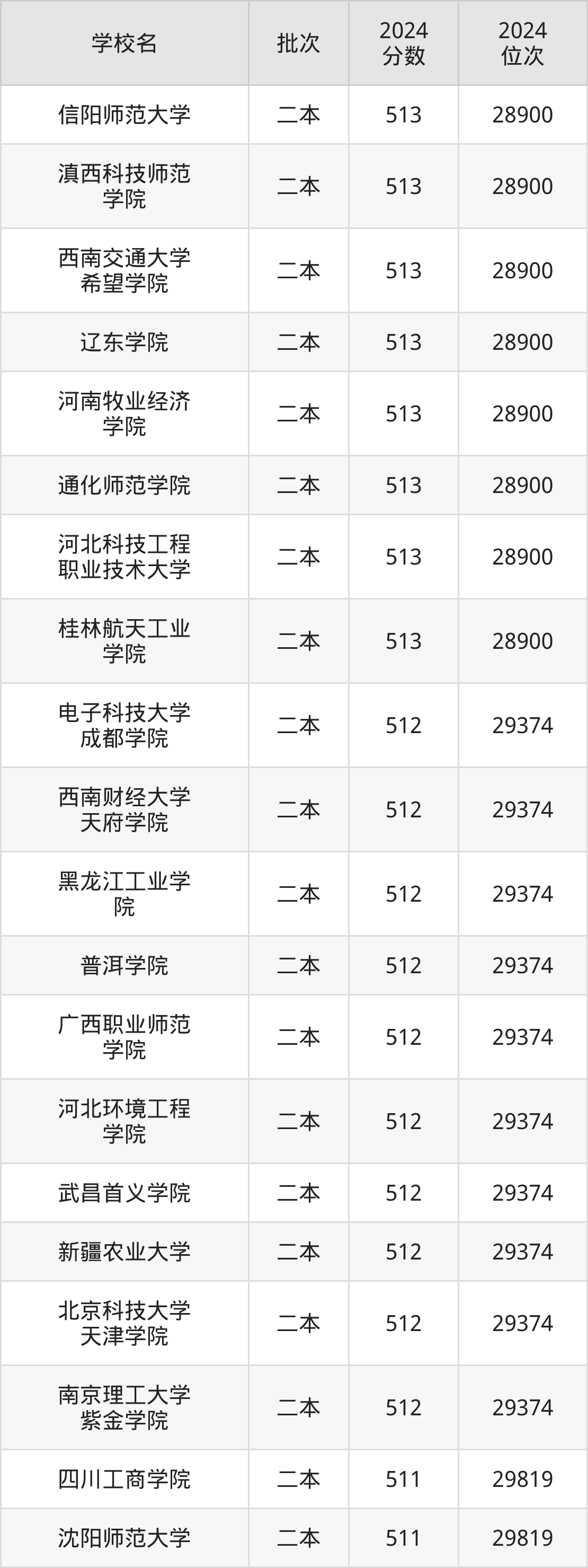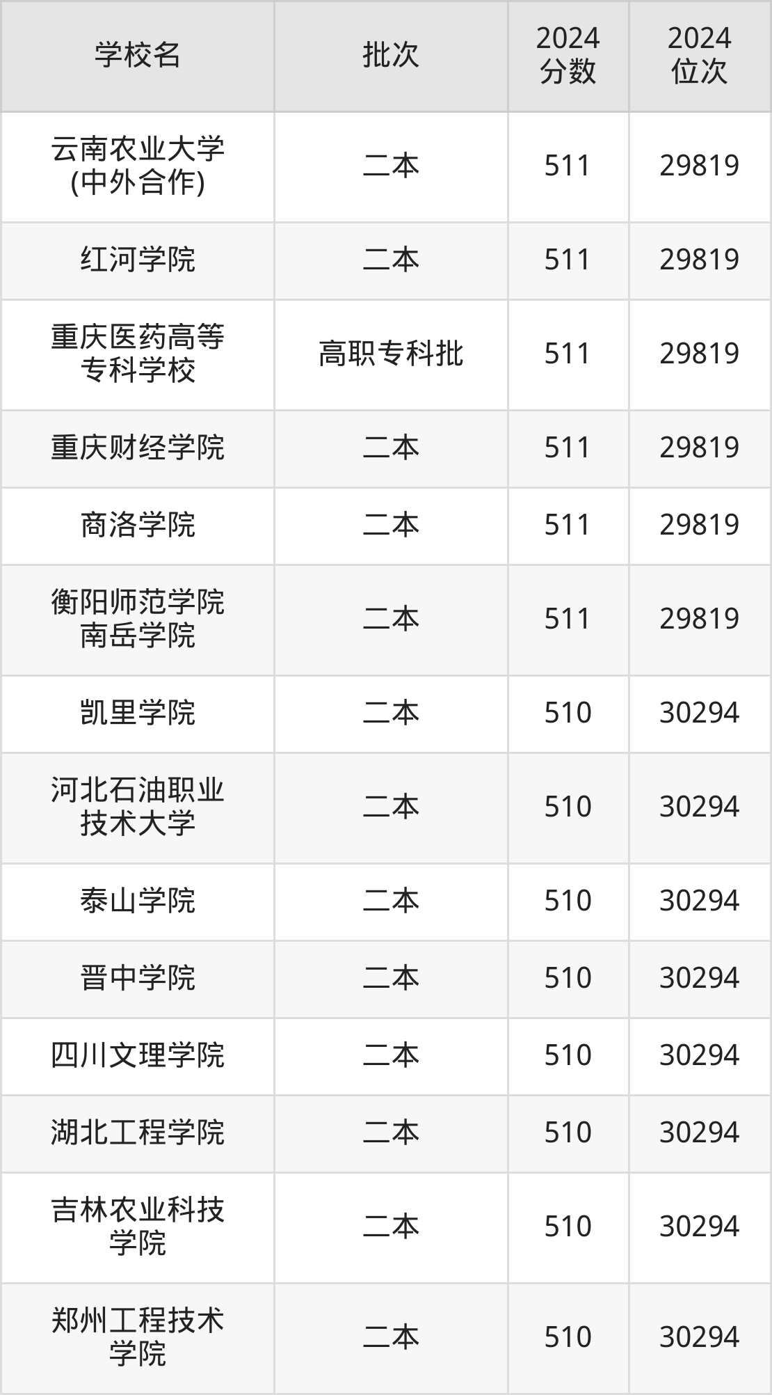 这些都是2025年高考理科43556名~44149名考生可以报考的大学,更多学校名单如下表所示: