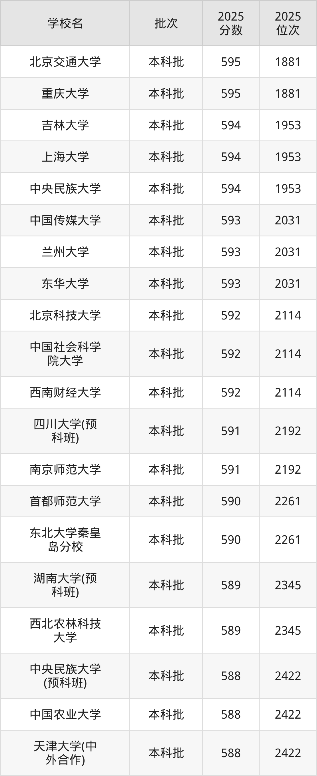 2025年重庆高考历史类588分(2346名~2422名)能上的大学有天津大学(中外合作)、中央民族大学(预科班)、中国农业大学。
