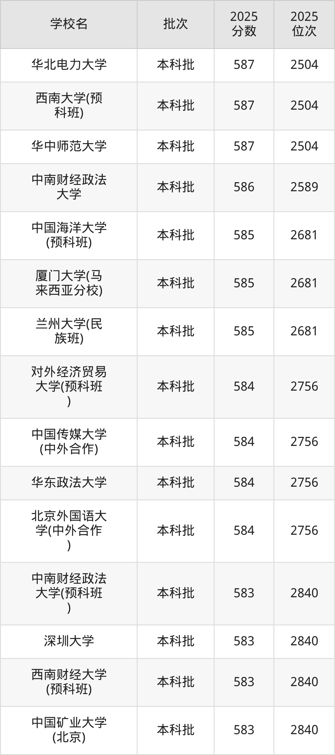 2025年重庆高考物理类588分(15347名~15673名)能上的大学有华中师范大学(预科班)、中南财经政法大学。