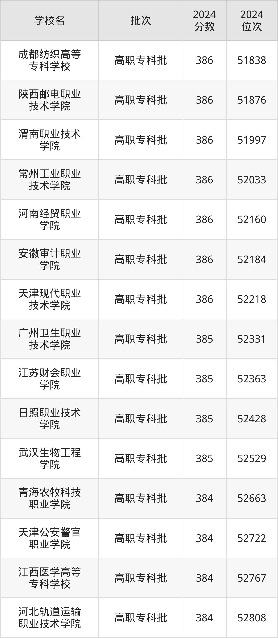 2024年陕西高考文科385分(52230名~52631名)能上的大学有江苏财会职业学院、日照职业技术学院、武汉生物工程学院、广州卫生职业技术学院。
