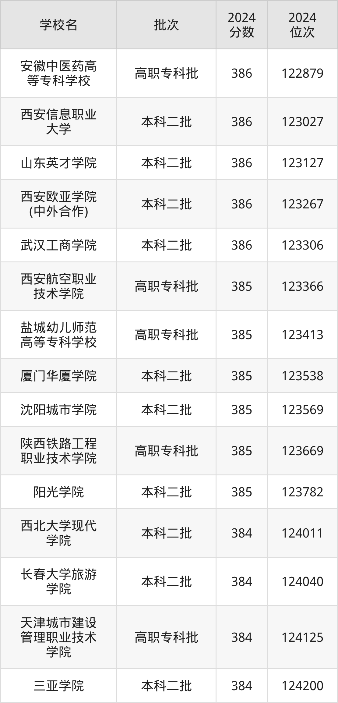2024年陕西高考理科385分(123363名~123992名)能上的大学有沈阳城市学院、盐城幼儿师范高等专科学校、阳光学院、厦门华厦学院等。