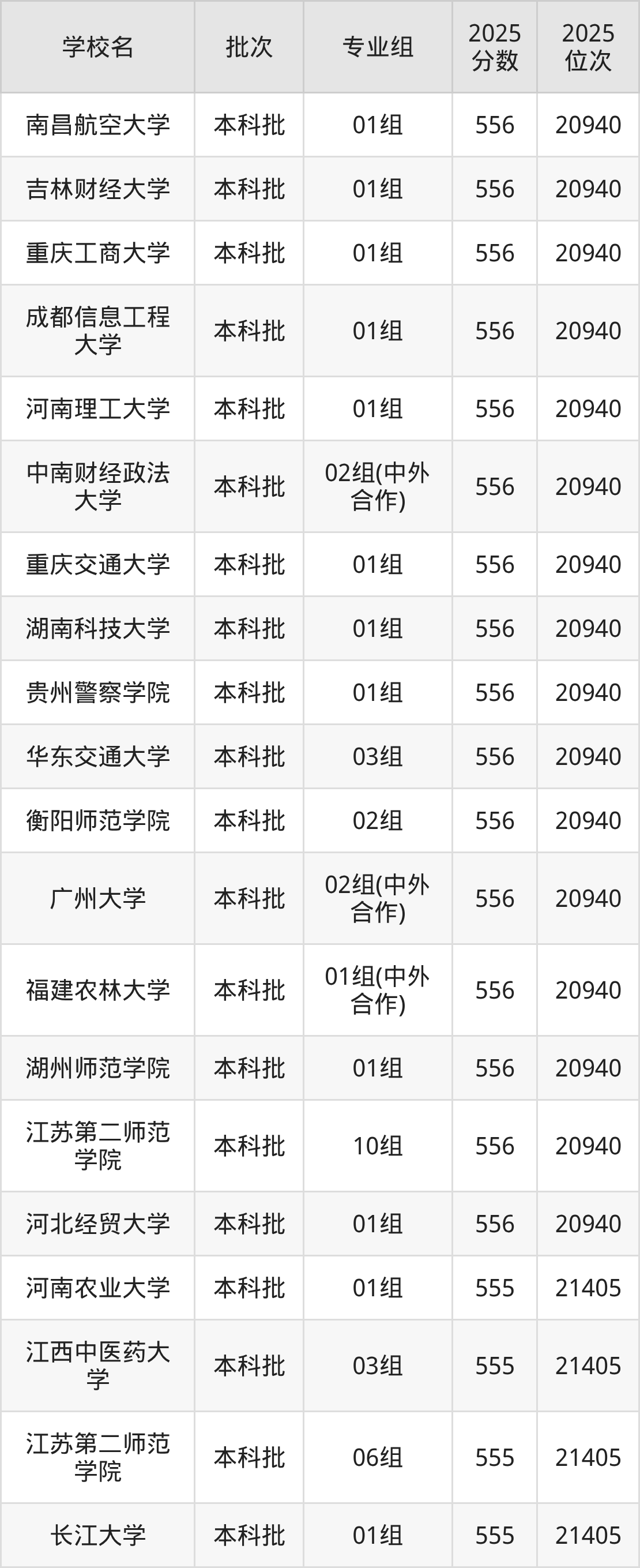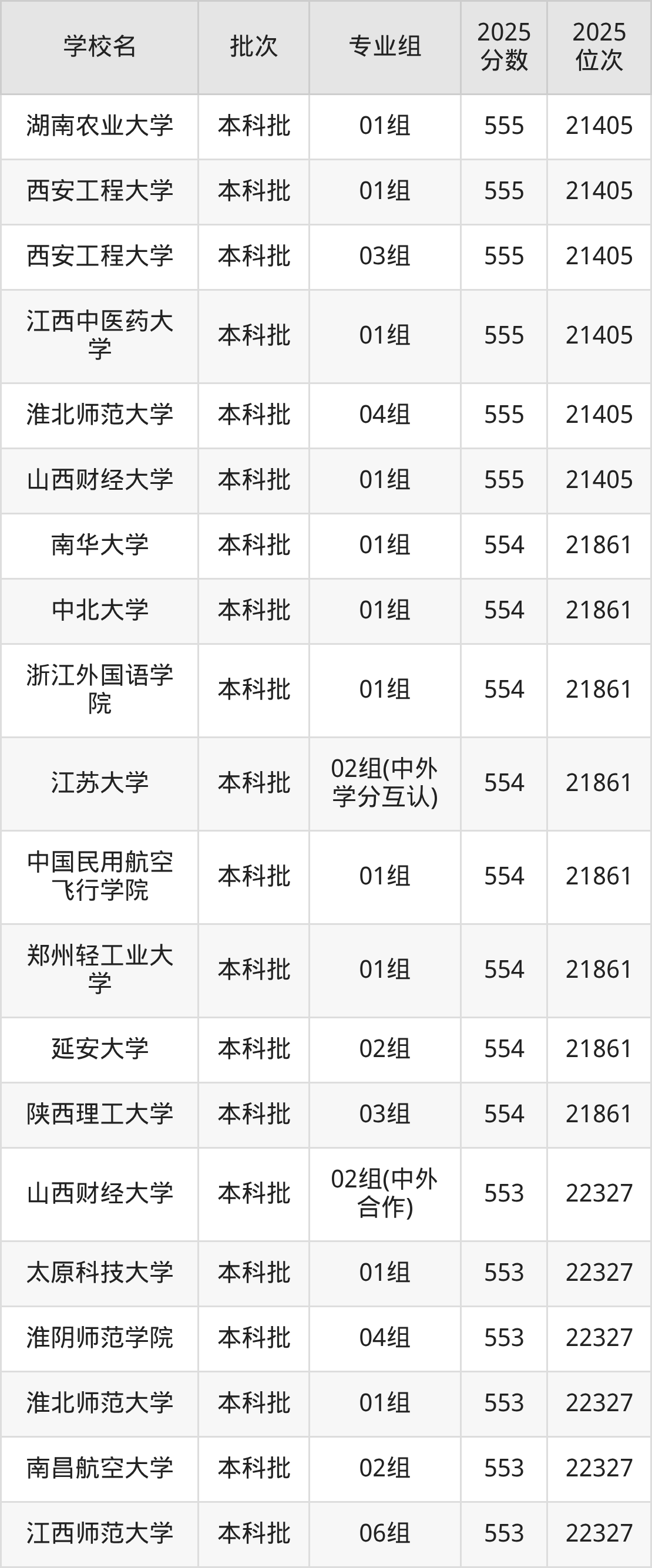 2025年江苏高考历史类554分(21406名~21861名)能上的大学有中国民用航空飞行学院01组、江苏大学02组(中外学分互认)、浙江外国语学院01组、中北大学01组等。
