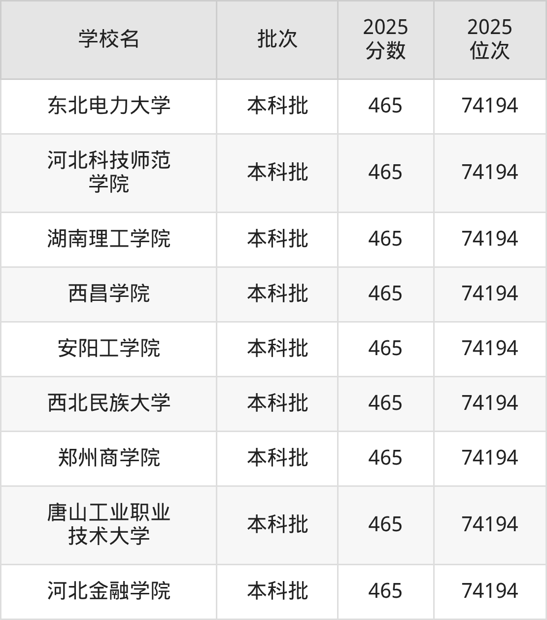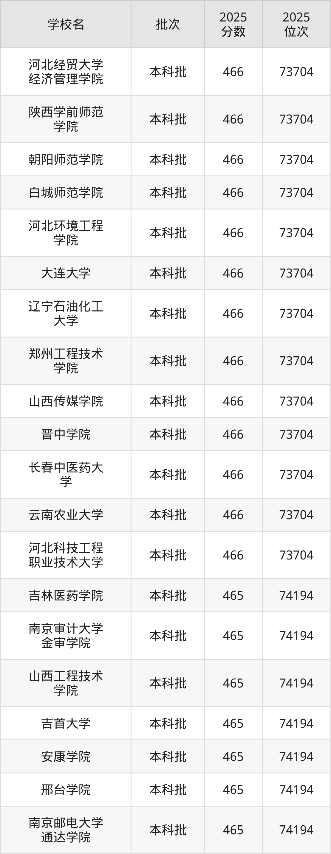 2025年辽宁高考物理类465分(73705名~74194名)能上的大学有吉林医药学院、河北金融学院、唐山工业职业技术大学、郑州商学院等。