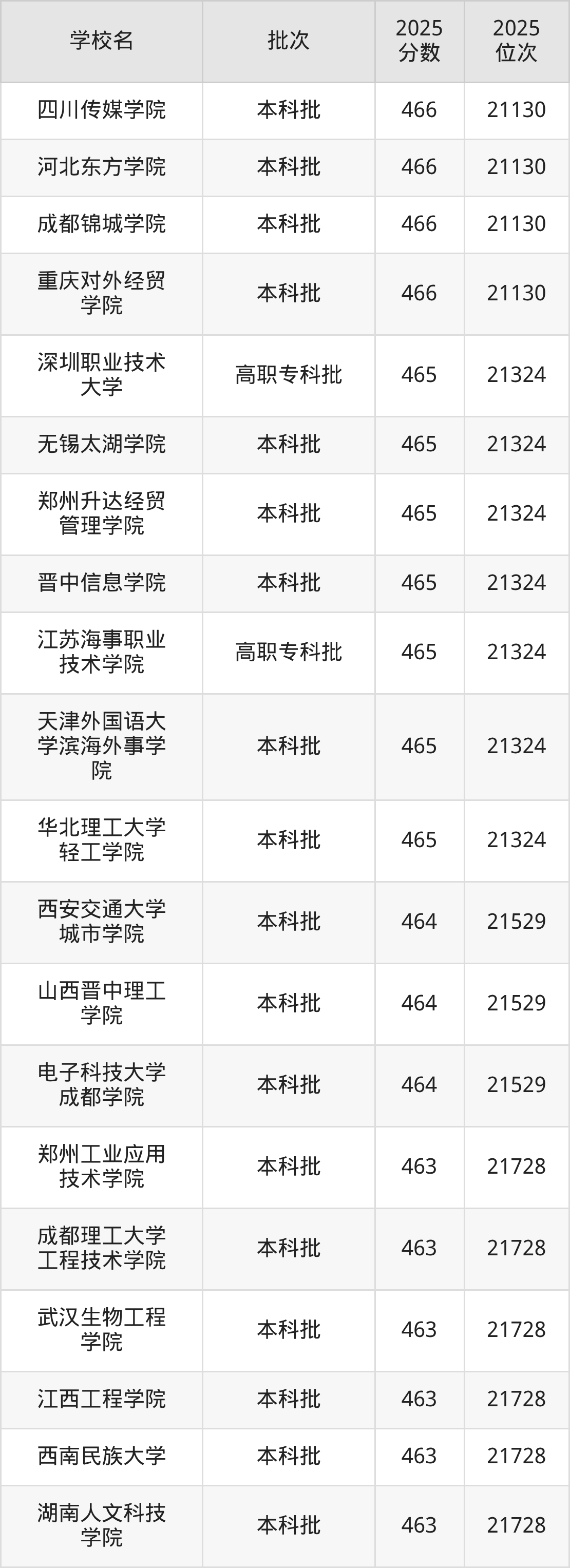 2025年辽宁高考历史类465分(21131名~21324名)能上的大学有深圳职业技术大学、天津外国语大学滨海外事学院、无锡太湖学院、郑州升达经贸管理学院等。