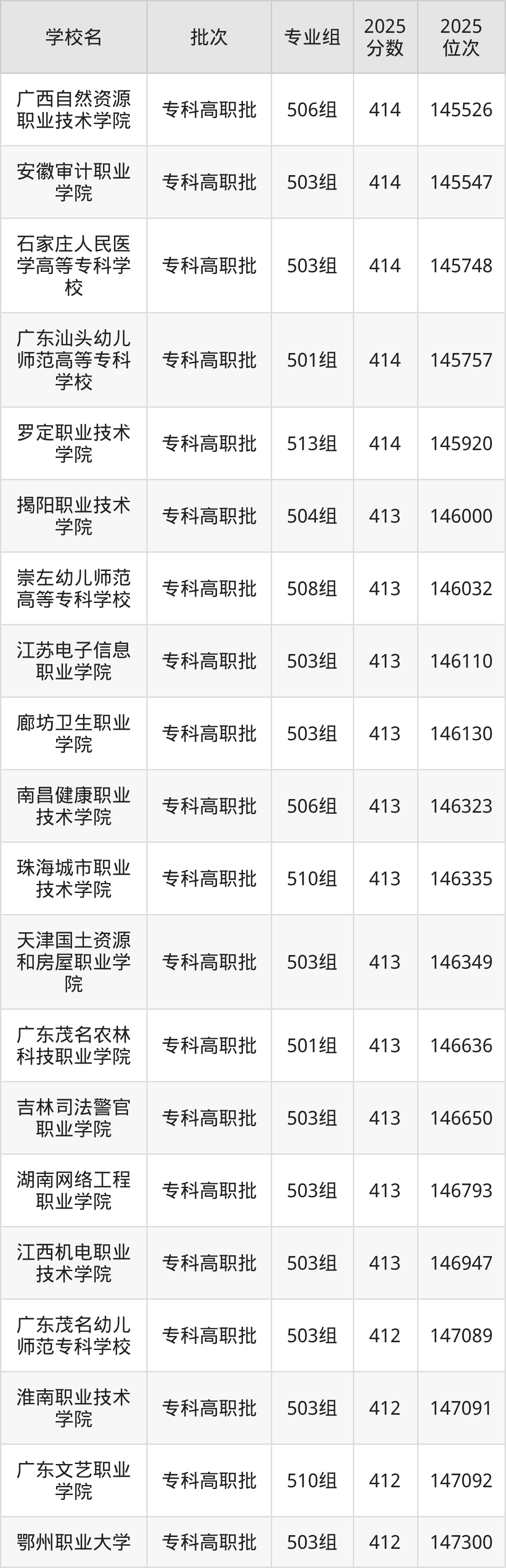 2025年广东高考历史类413分(145910名~147073名)能上的大学有湖南网络工程职业学院503组、天津国土资源和房屋职业学院503组、江苏电子信息职业学院503组、吉林司法警官职业学院503组等。