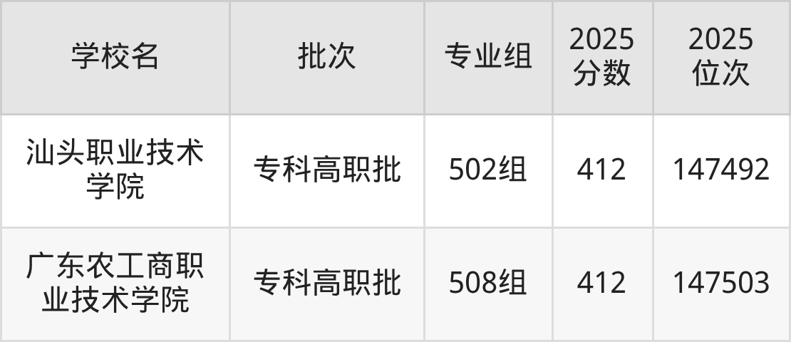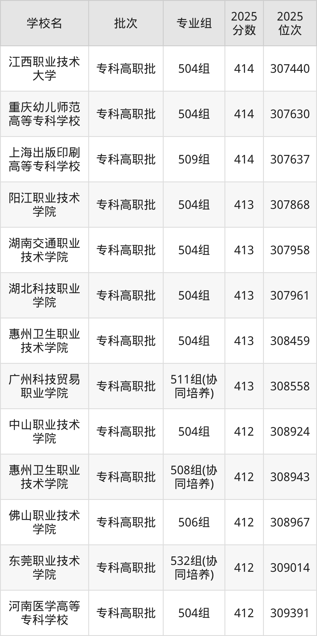 2025年广东高考物理类413分(307668名~308909名)能上的大学有湖南交通职业技术学院504组、阳江职业技术学院504组、广州科技贸易职业学院511组(协同培养)、湖北科技职业学院504组等。