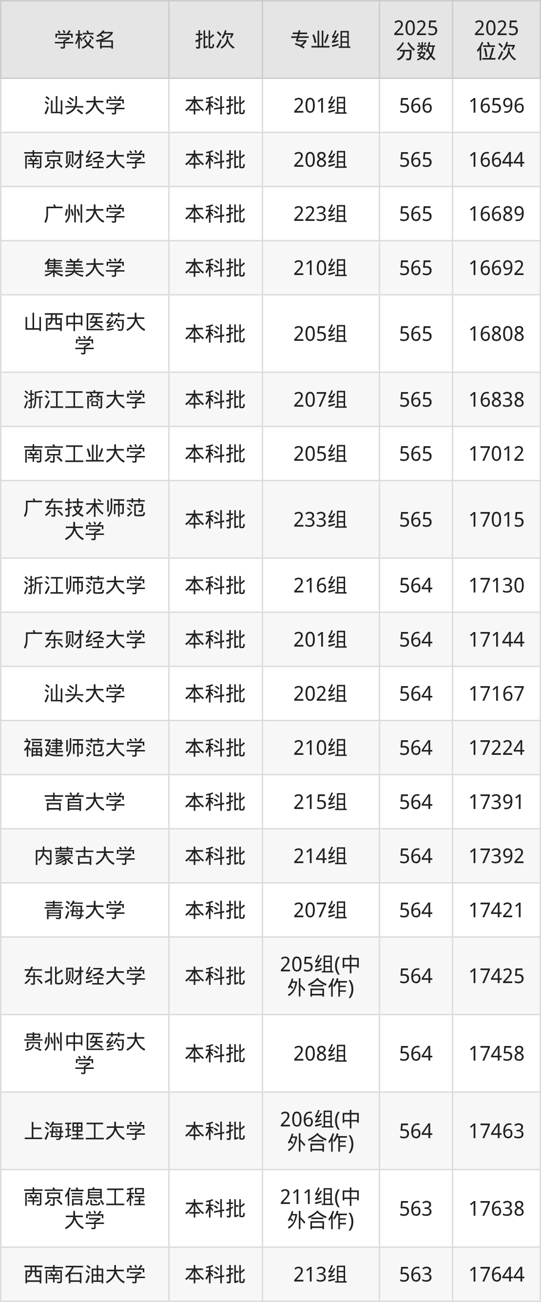 2025年广东高考历史类564分(17054名~17511名)能上的大学有内蒙古大学214组、东北财经大学205组(中外合作)、上海理工大学206组(中外合作)、浙江师范大学216组等。