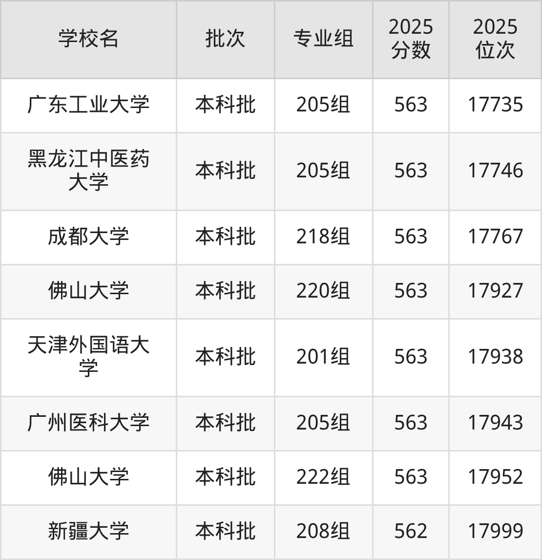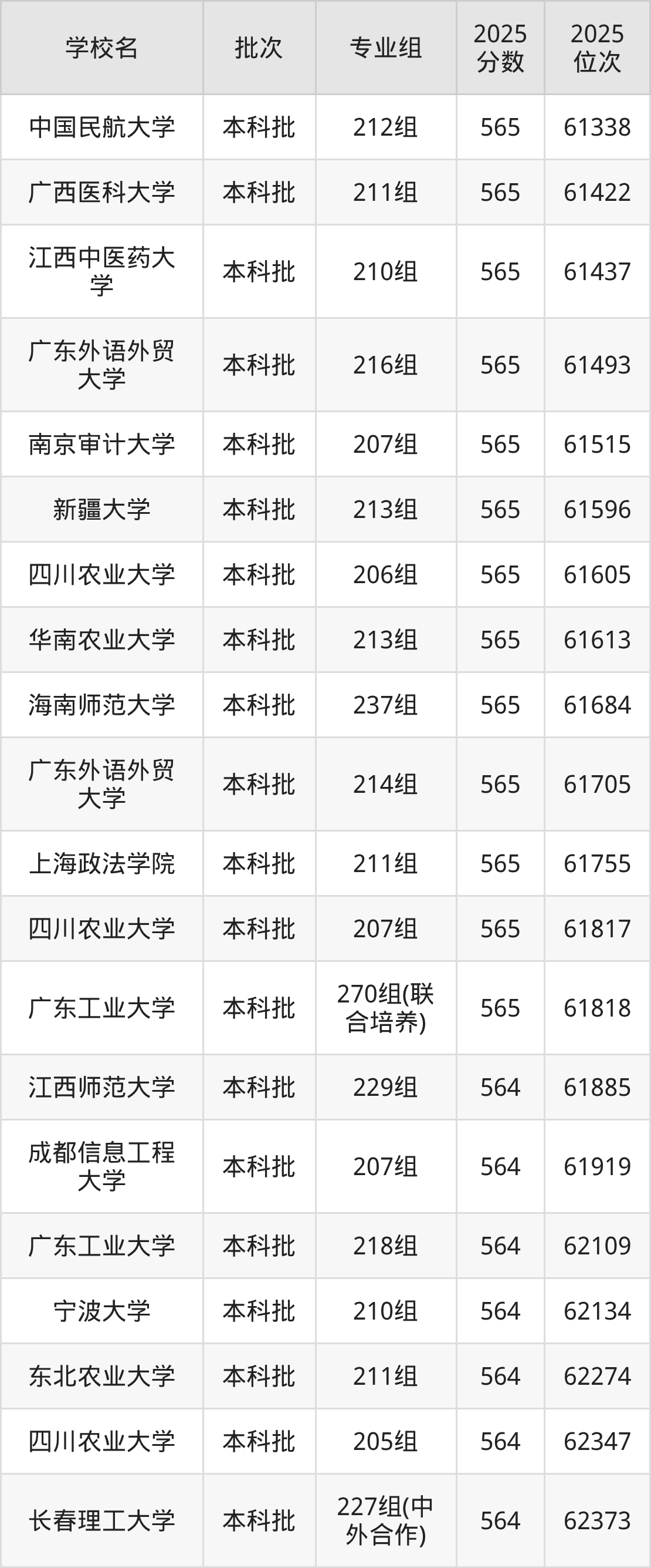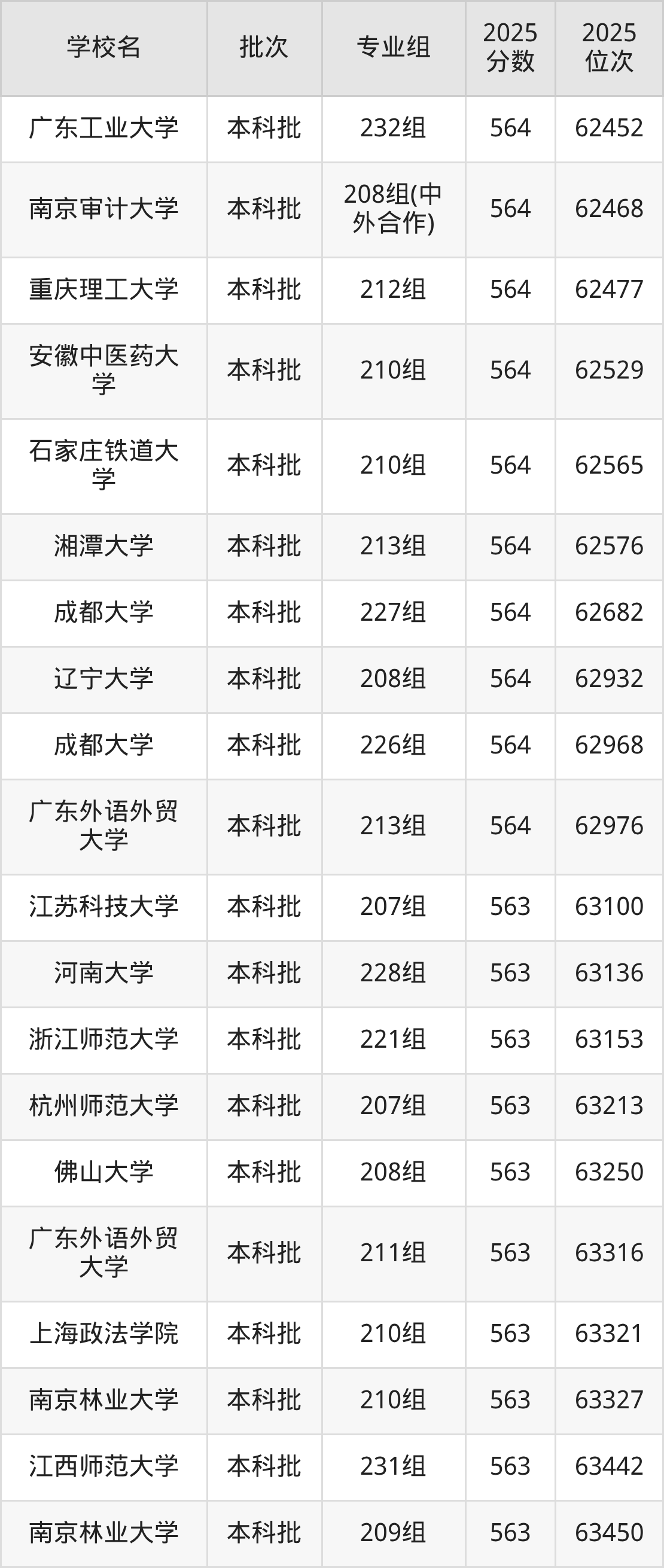 2025年广东高考物理类564分(61837名~63021名)能上的大学有石家庄铁道大学210组、辽宁大学208组、长春理工大学227组(中外合作)、东北农业大学211组等。