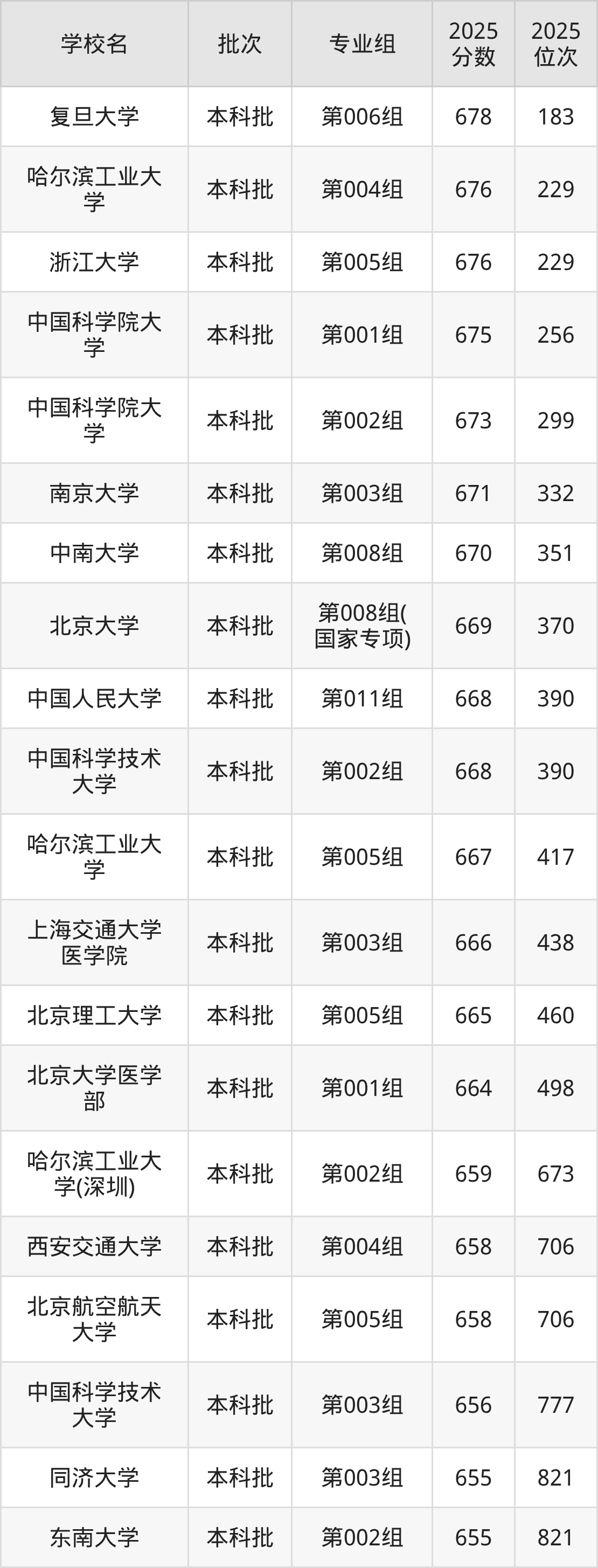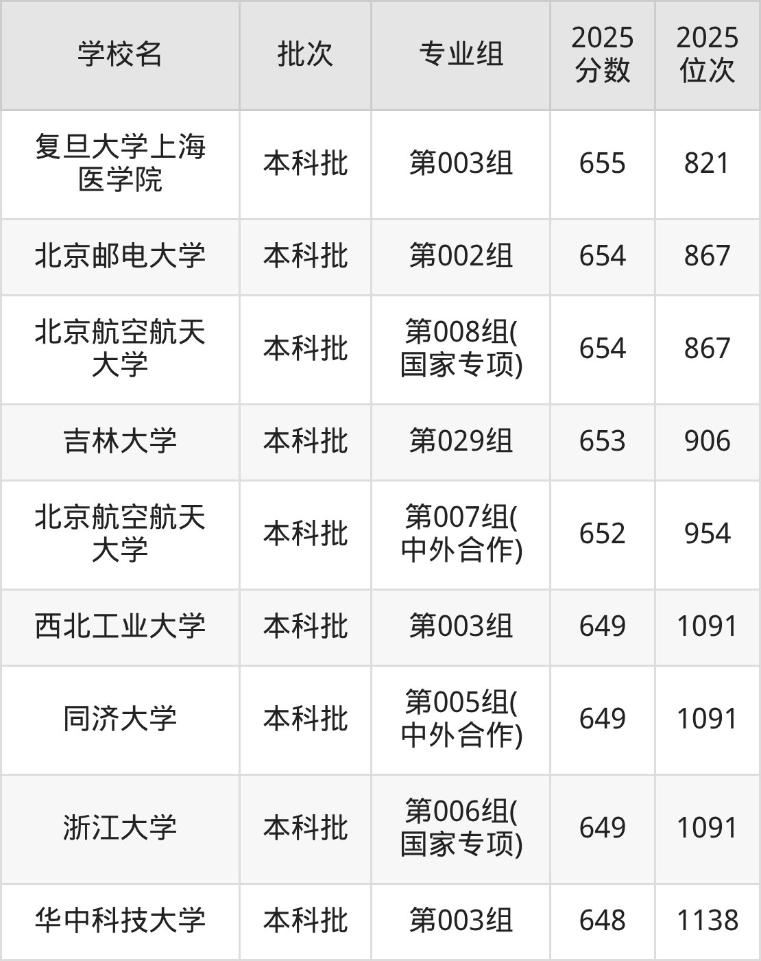 2025年吉林高考物理类658分(674名~706名)能上的大学有北京航空航天大学第005组、西安交通大学第004组。